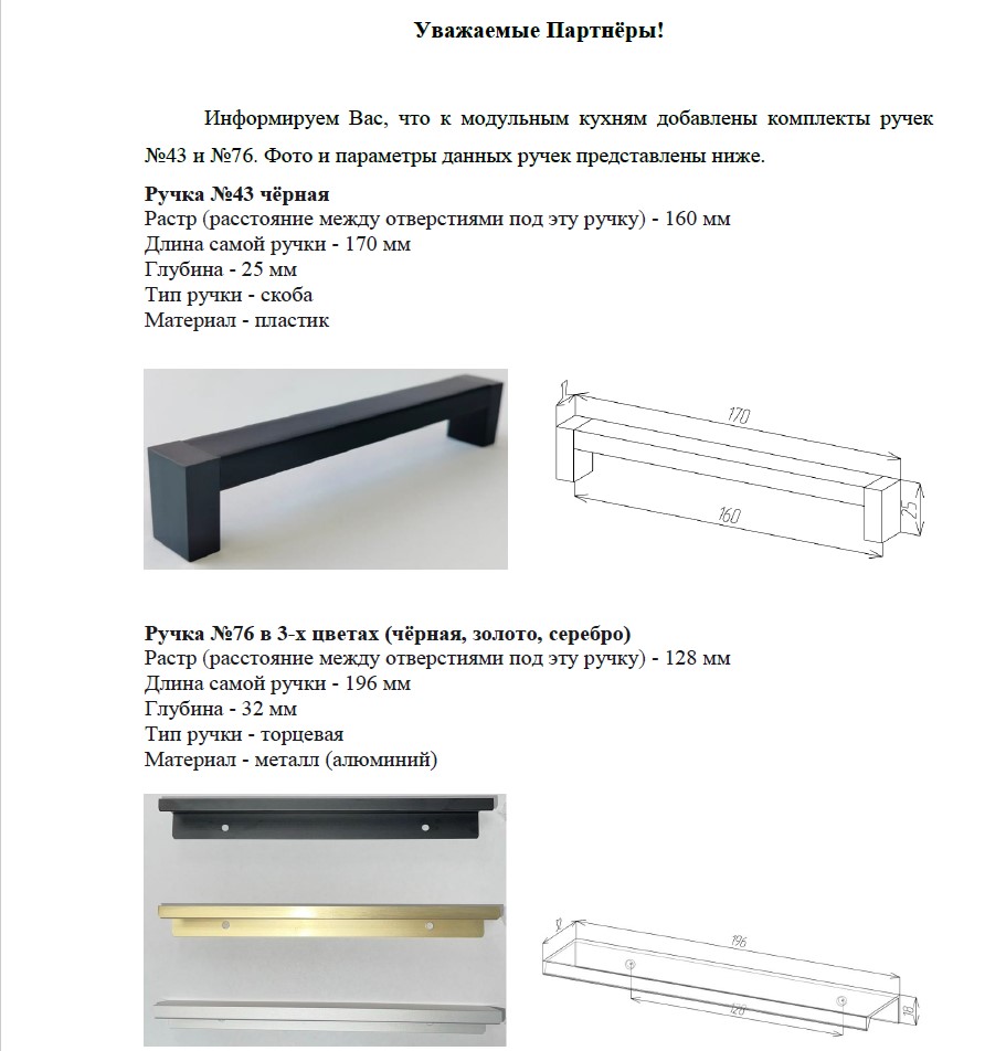 К модульным кухням добавлены комплекты ручек №43 и №76, фабрика BTS