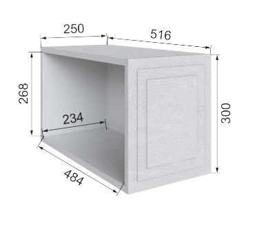 Антресоль исполнена из качественных материалов (корпус — ЛДСП, фасад — МДФ), ширина 250 мм, высота 300 мм и глубина 516 мм.