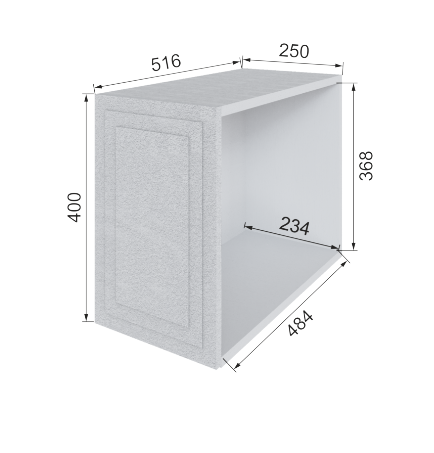 Антресоль исполнена из качественных материалов (корпус — ЛДСП, фасад — МДФ), ширина 250 мм, высота 400 мм и глубина 516 мм.