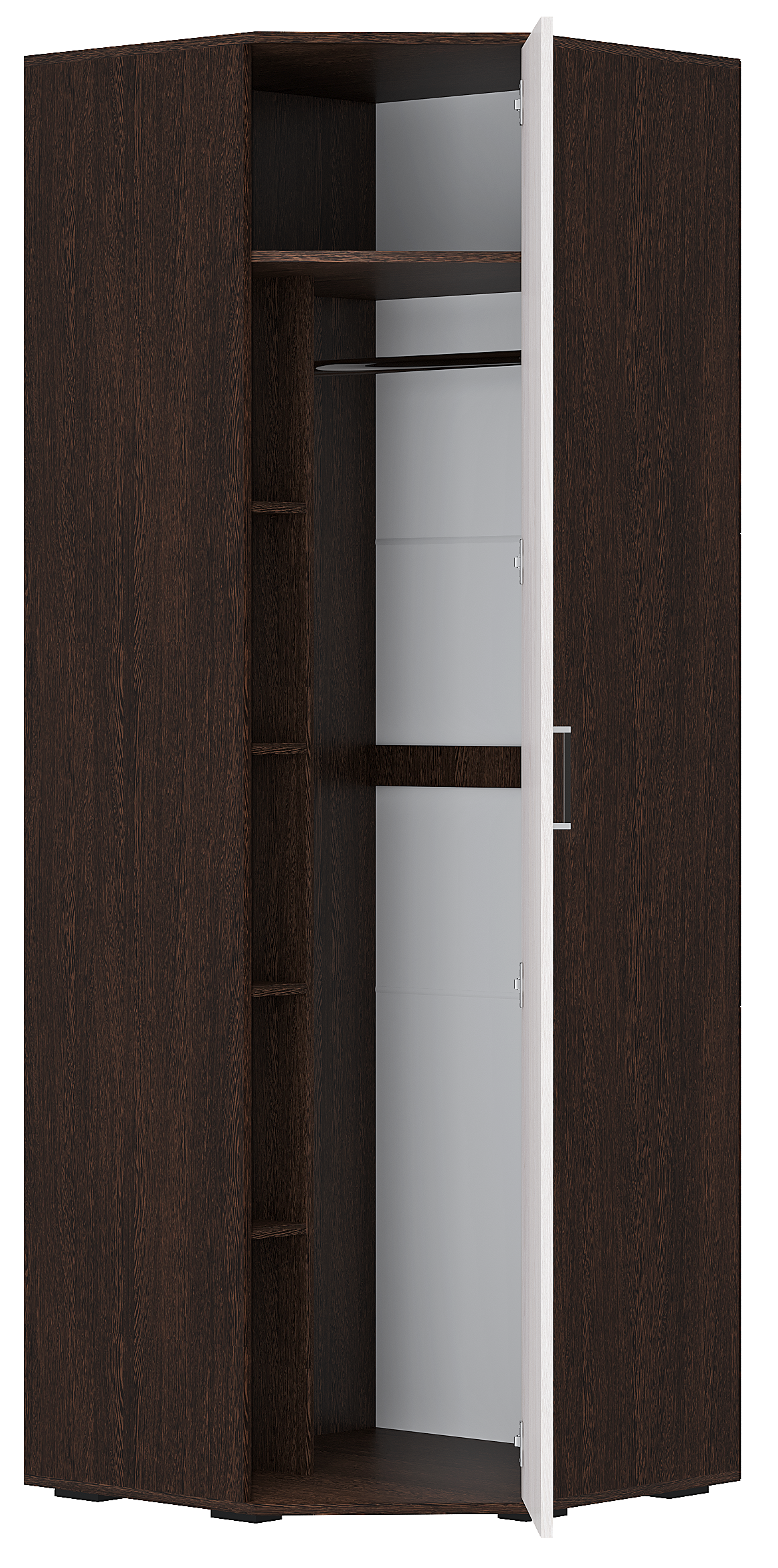 В угловом шкафу "Белла" из одноименной модульной серии можно разместить большой гардероб. В комплектацию входит отделение с хромированной штангой для вешалок, несколько полок для хранения белья и вещей, а также вместительная верхняя полка.