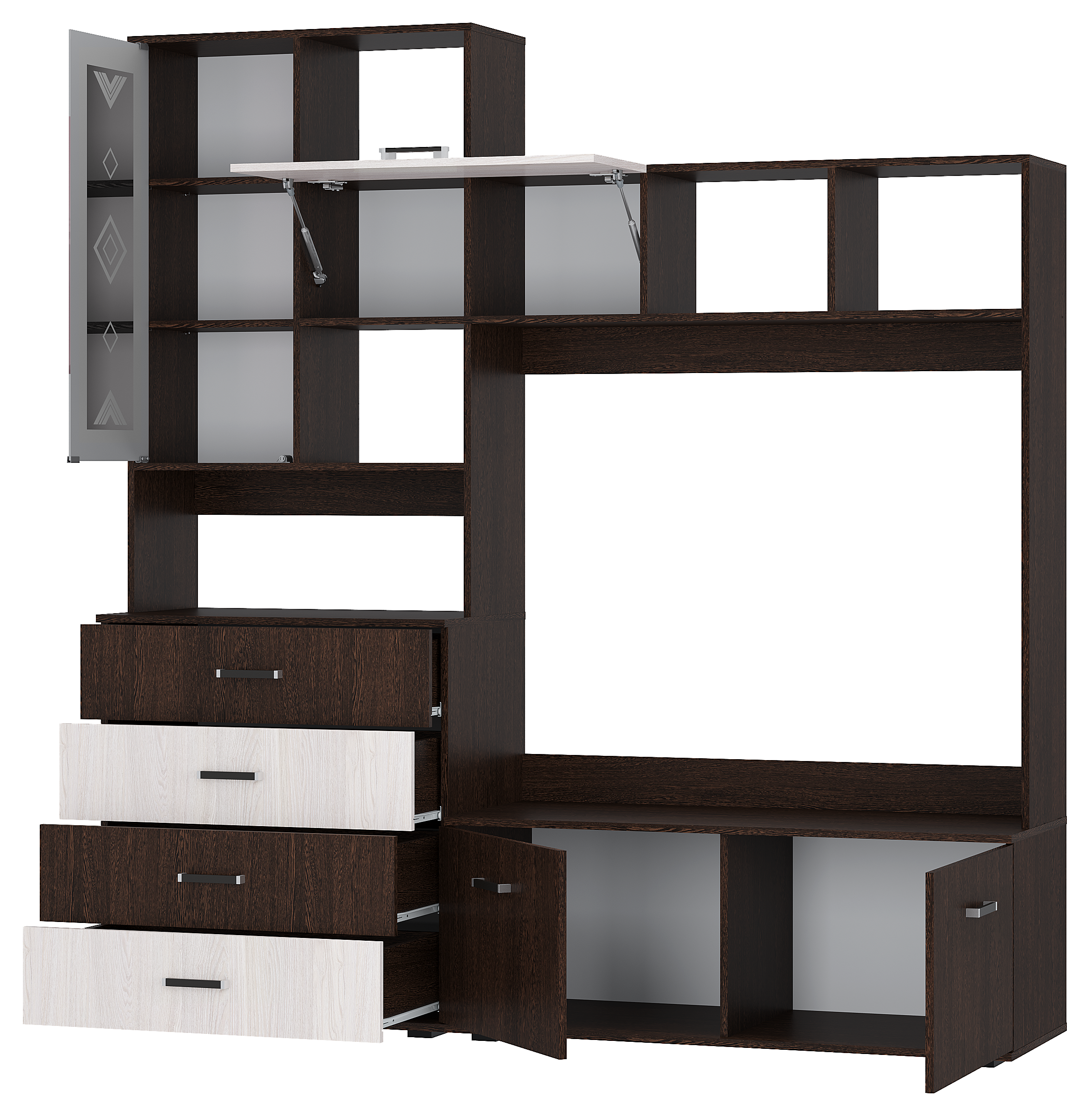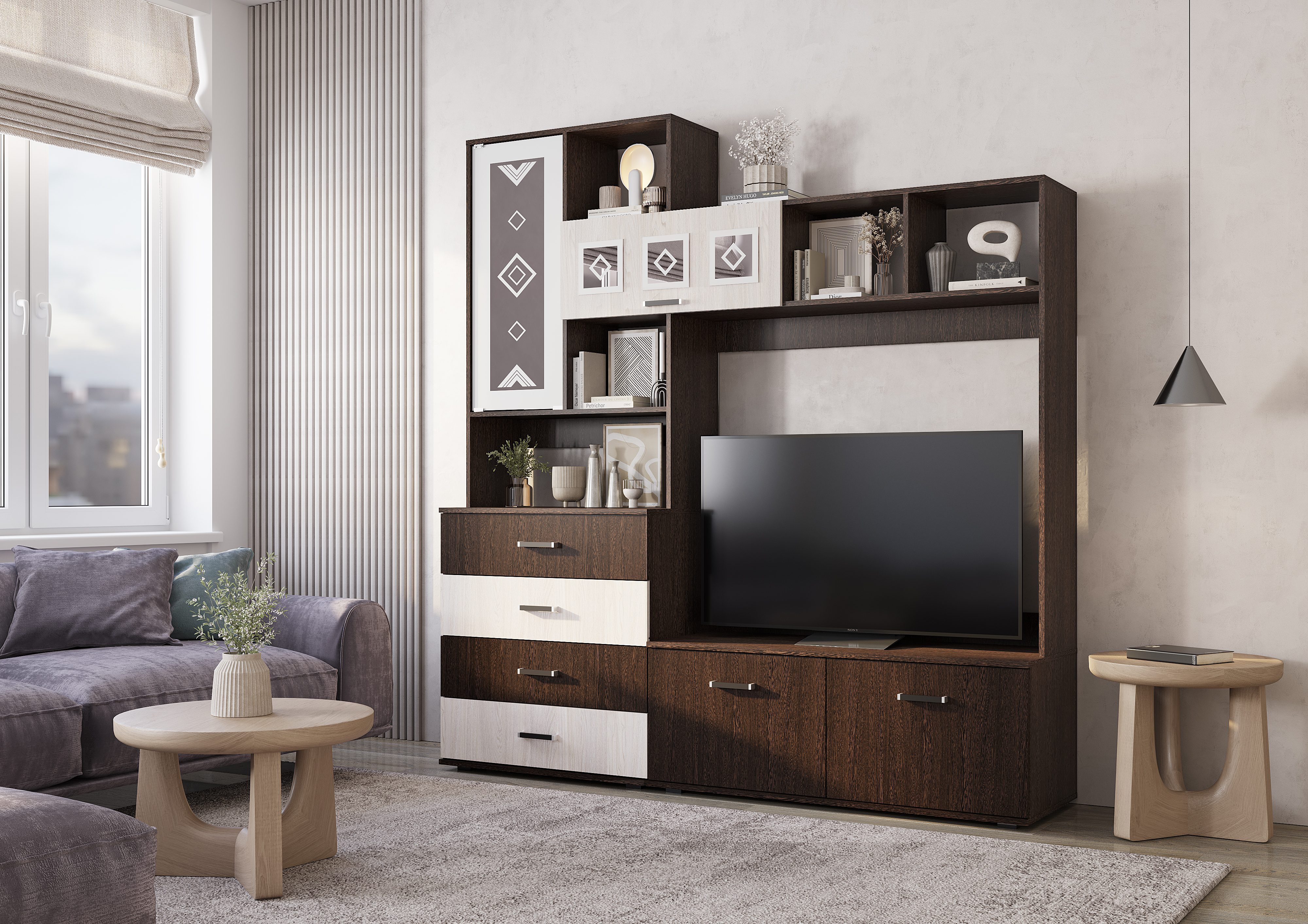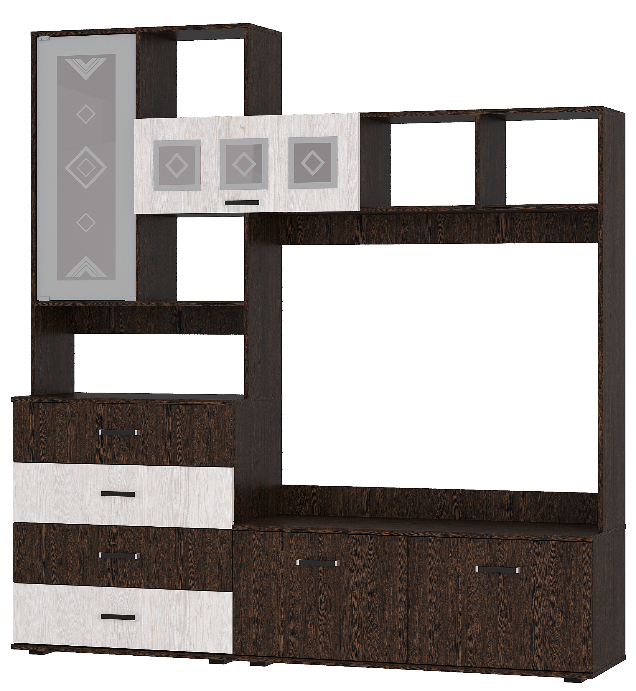 Гостиная "Белла" - это функциональная стилизованная модель. Особый шарм ей придаёт сочетание корпуса и фасада в цвете "ясень белый", а также отделка зеркалами с пескоструйной обработкой и еврокромкой. Удобная зона для ТВ, вместительные выдвижные ящики, закрытые и открытые полки позволяют максимально эффективно использовать пространство.