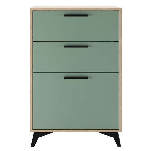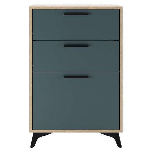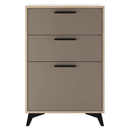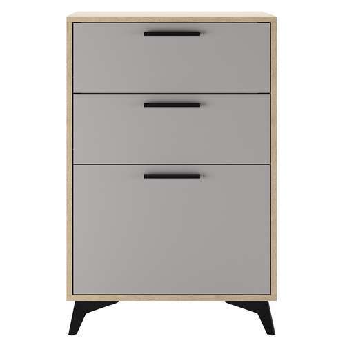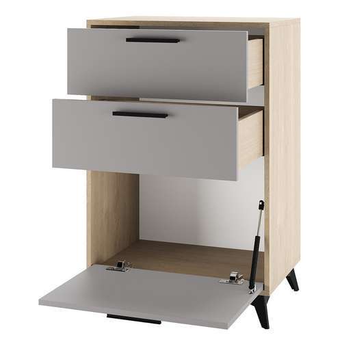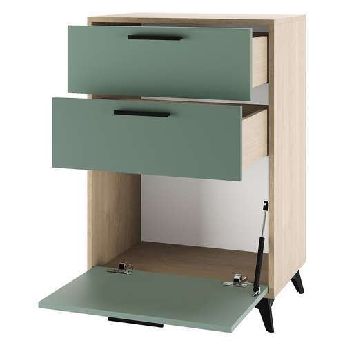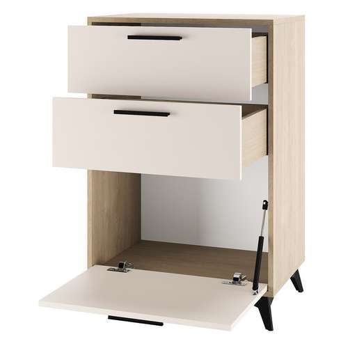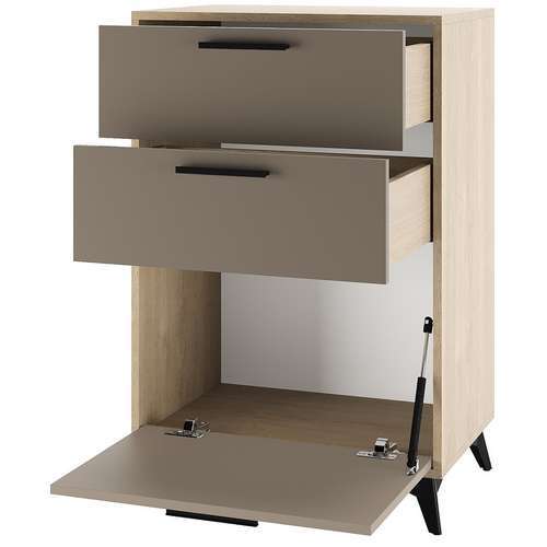 Тумба 600 1С2Я "ЕВА" с откидным фасадом (газлифт), с ящиками на направляющих скрытого монтажа с доводчиками. Фасады, крышка и лицевой периметр тумбы обработаны кромкой 1 мм. Чёрные металлические ручки и ножки-опоры.