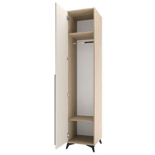 Пенал 480 1С "ЕВА" с полками и металлической штангой. Фасад и лицевой периметр пенала обработаны кромкой 1 мм. Чёрная металлическая ручка-рейлинг и ножки-опоры.