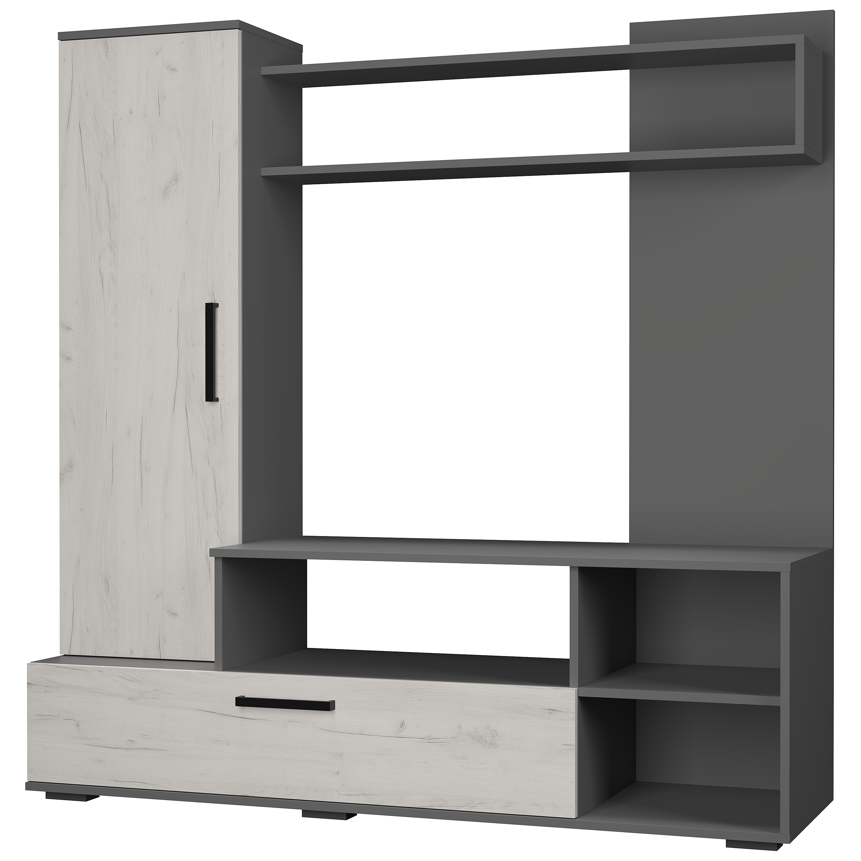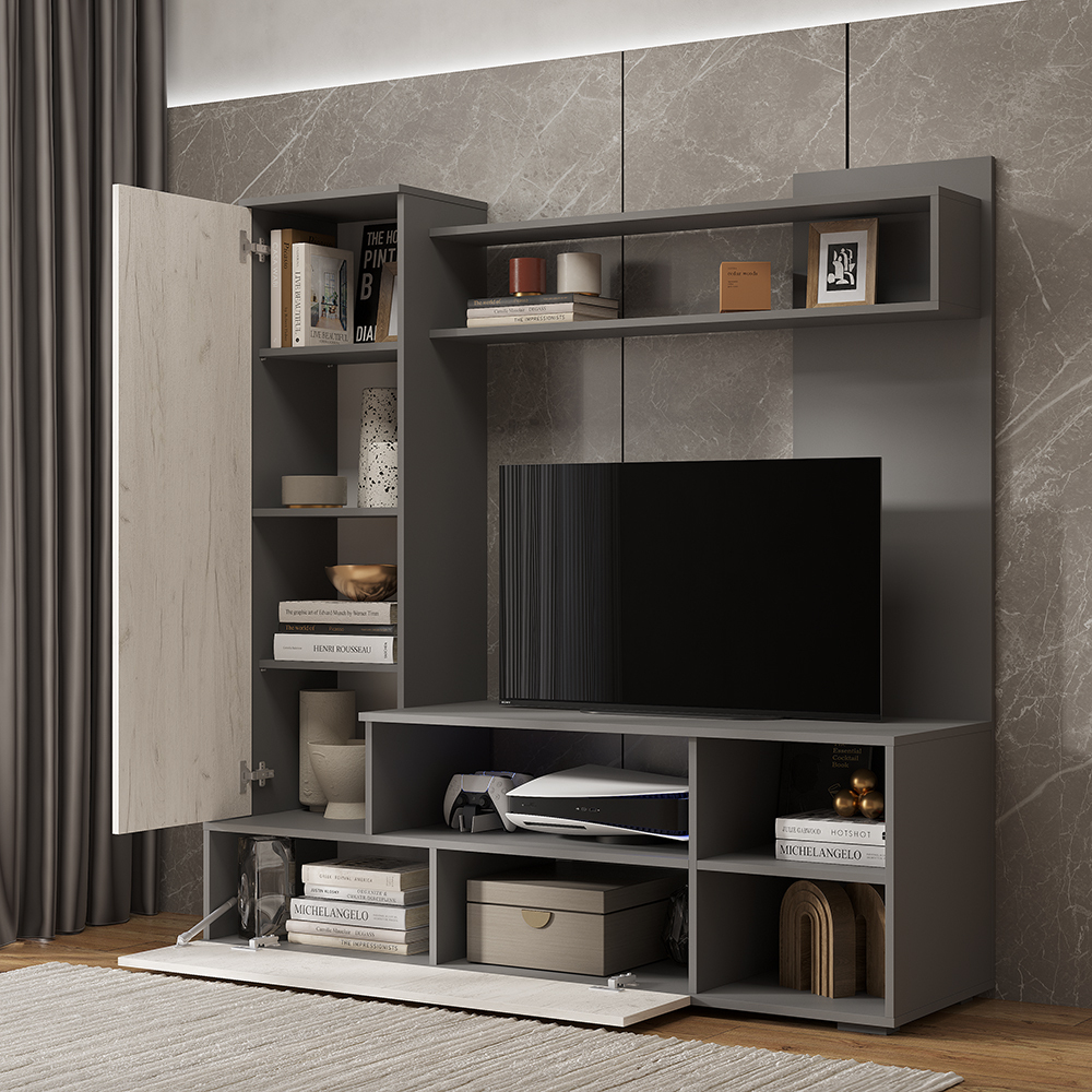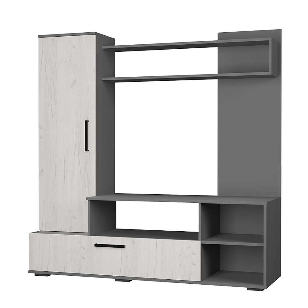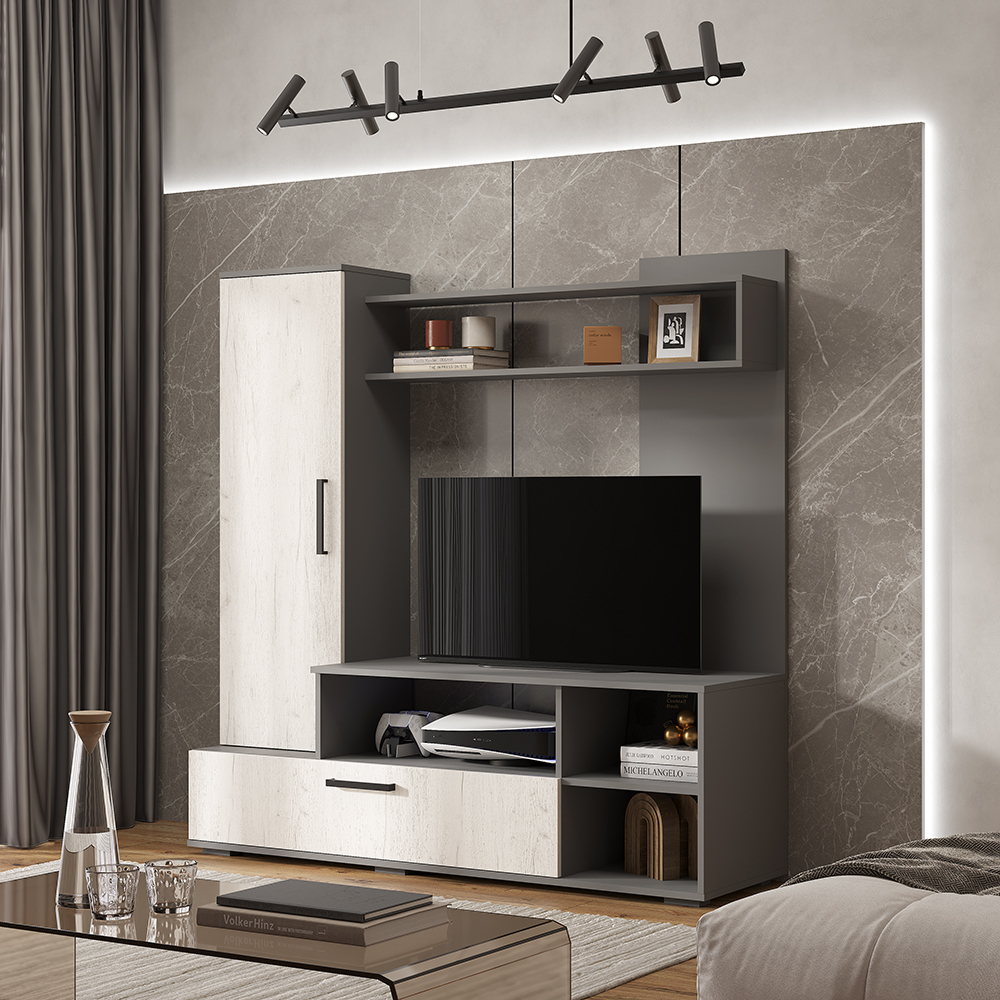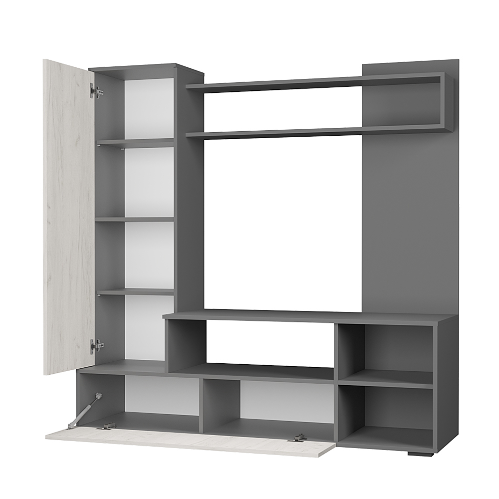 Гостиная "Евро-2" - гармоничное сочетание яркого дизайна и минималистичных форм. Просторная ниша под ТВ. Закрытая боковая секция для хранения крупных и мелких вещей. Легкое открывание нижней секции благодаря механизму "газлифт". Стильная полка над нишей под ТВ - место для декора. Удобные и вместительные полки под телевизором для хранения техники, книг и предметов интерьера.