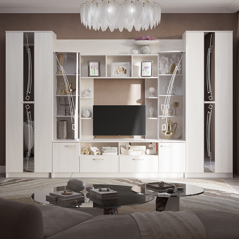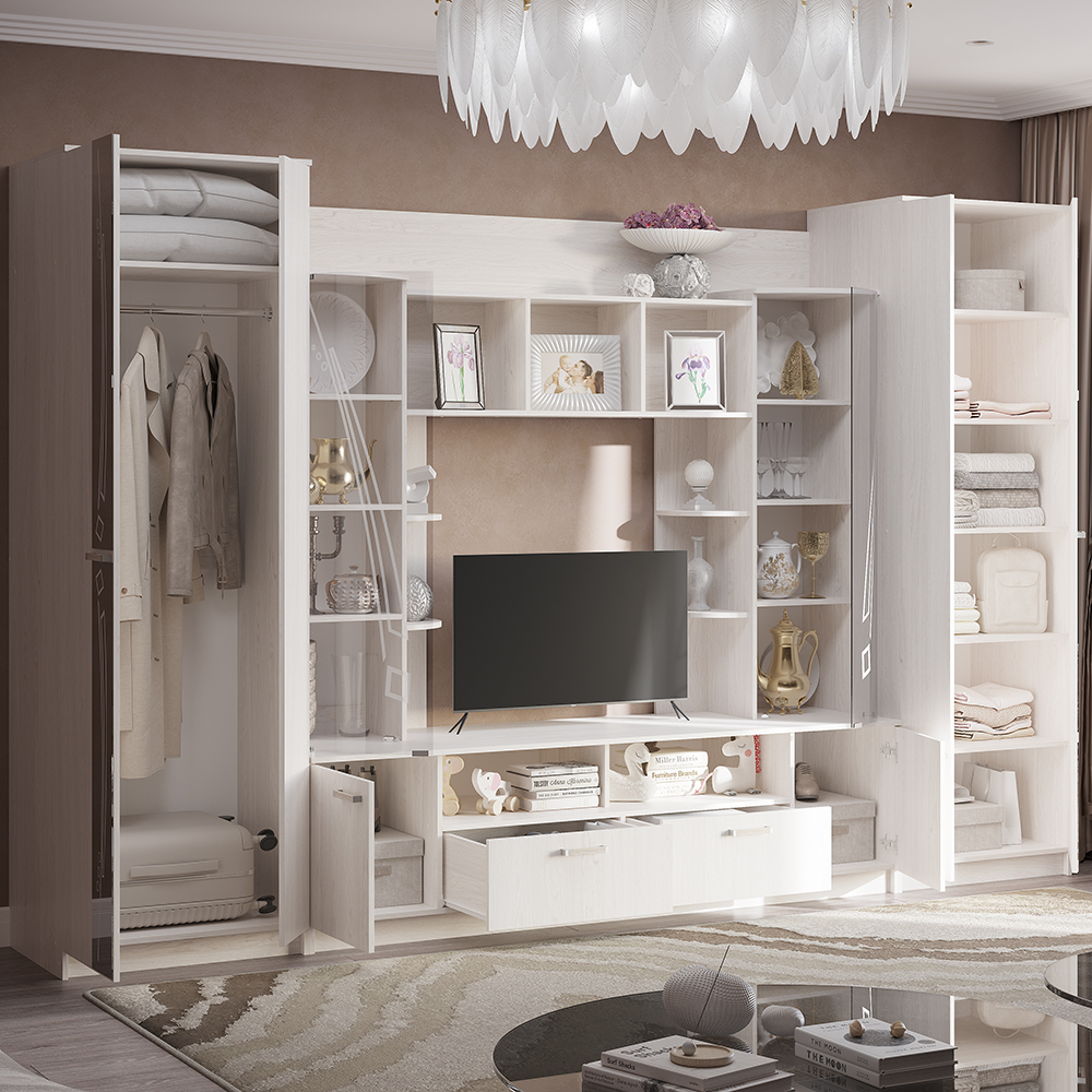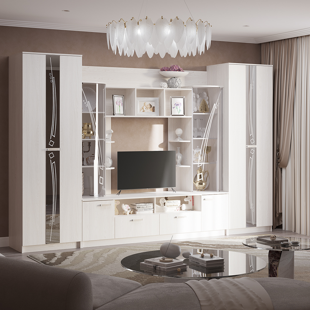 Гостиная «Венеция» – идеальный вариант для размещения большого количества вещей, включая одежду, ведь данная модель имеет зоны для ее хранения. Открытые полки вокруг ниши для телевизора позволят не только хранить предметы повседневного обихода, но и украсить интерьер. Стильные стеклостворки придают особую элегантность композиции изделия.
