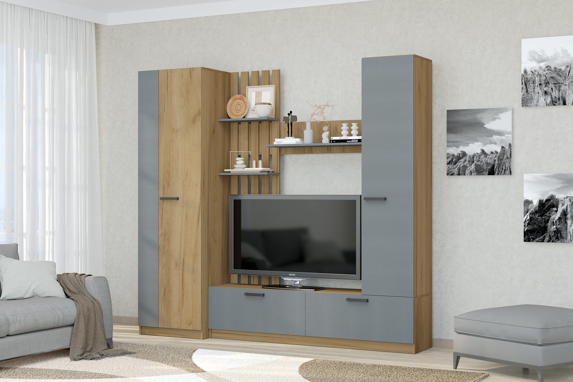 Гостиная «Юджи» от бренда Zaron – это сочетание стиля, функциональности и долговечности. Изготовлена из качественного ЛДСП, она станет идеальным дополнением вашего интерьера. Современные материалы обеспечивают прочность и устойчивость к внешним воздействиям. Размеры гостиной (Ш 2300 х В 2100 х Г 470 мм) позволяют разместить все необходимое, а нишу под телевизор можно адаптировать под ваш любимый размер экрана (1345 x 1000 мм). Модель выполнена в классическом стиле, который никогда не выходит из моды. При этом двухлетняя гарантия подтверждает уверенность производителя в качестве своей продукции. Создайте уютную атмосферу у себя дома вместе с гостиной «Юджи».