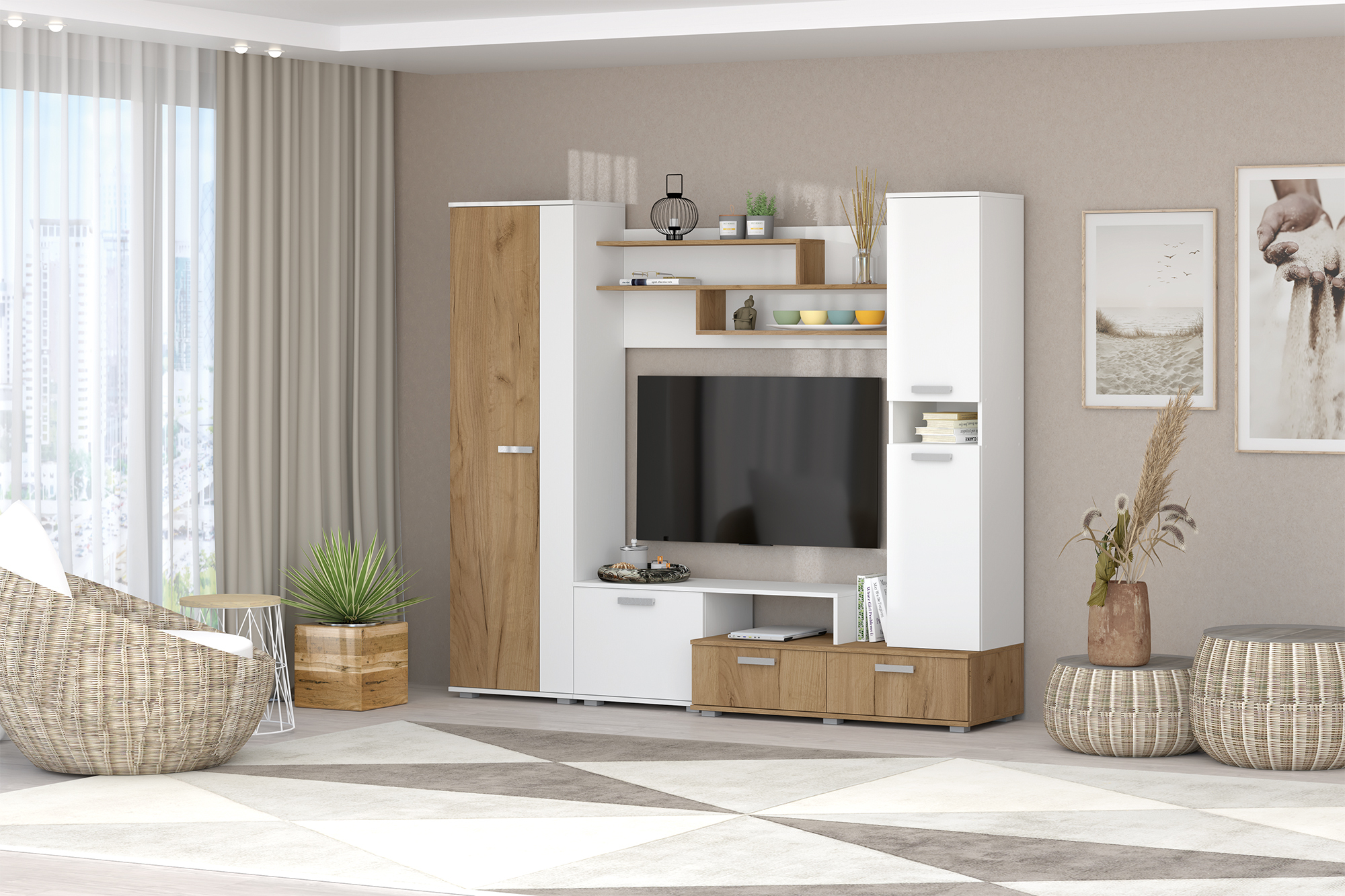 Гостиная «Юна» от бренда Zaron – это сочетание стиля, функциональности и долговечности! Изготовлена из качественного ЛДСП, она станет центральным элементом вашего интерьера. Размеры (Ширина: 2200 мм; Высота: 1870 мм; Глубина: 480 мм) идеально подойдут даже для просторной гостиной, а ниша под телевизор размером 1290*920 мм позволит удобно расположить технику. Продукт произведен в России и имеет гарантию 24 месяца. Создайте уютную атмосферу у себя дома вместе с гостиной «Юна».
