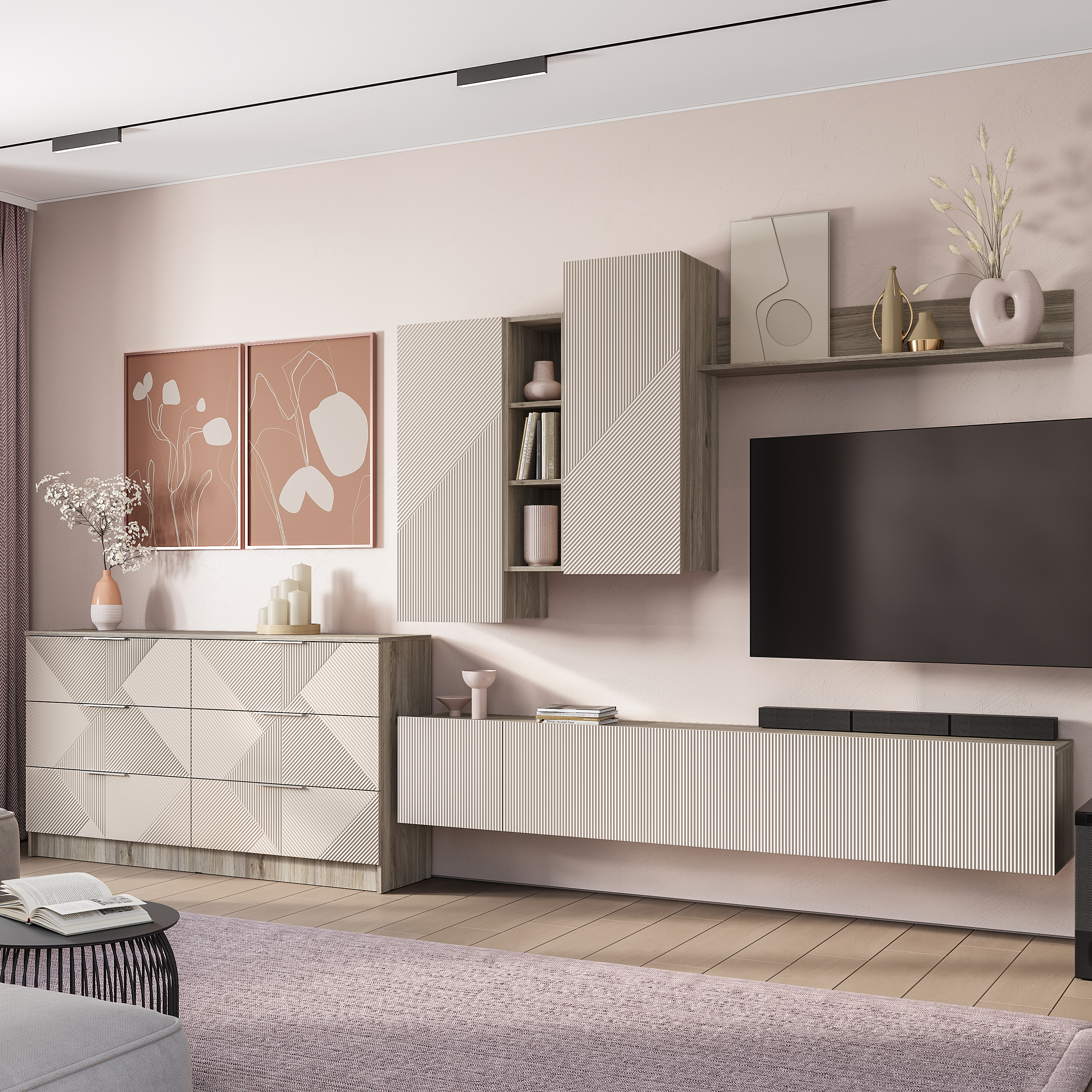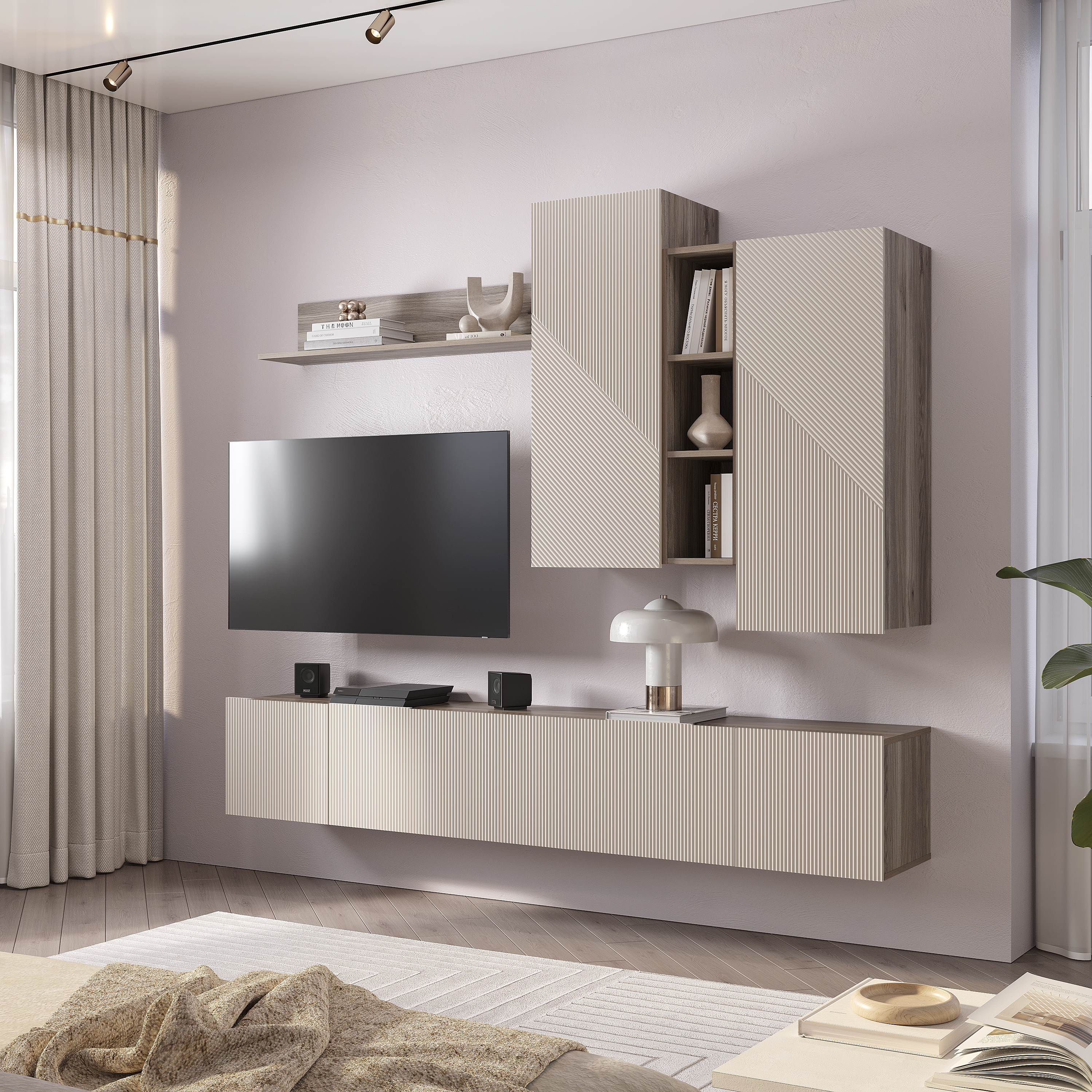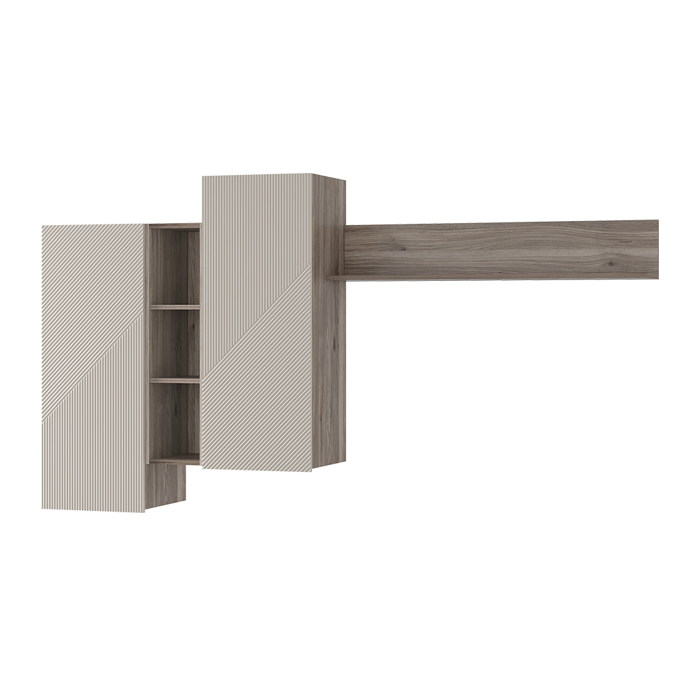 Гостиный модуль "Эмилия" ГМ-12 включает в себя ассиметричные шкафчики и длинную стильную рейку, что придает дизайну коллекции индивидуальность. В шкафчиках находится по две вместительных полки, а между ними расположены открытые узкие полки, которые идеально подойдут для хранения сувениров и элементов декора.
