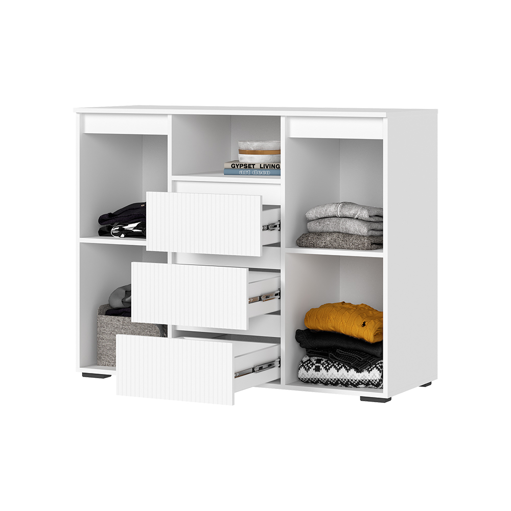 Вместительный комод Хелен 01 великолепно подойдет для спальни, детской комнаты или гостиной: три выдвижные полки, открытая ниша и два пенальных отсека по бокам разместят ваши вещи, одежду и аксессуары, а на поверхности вы можете расставить рамки с фотографиями или украсить предметами интерьера.