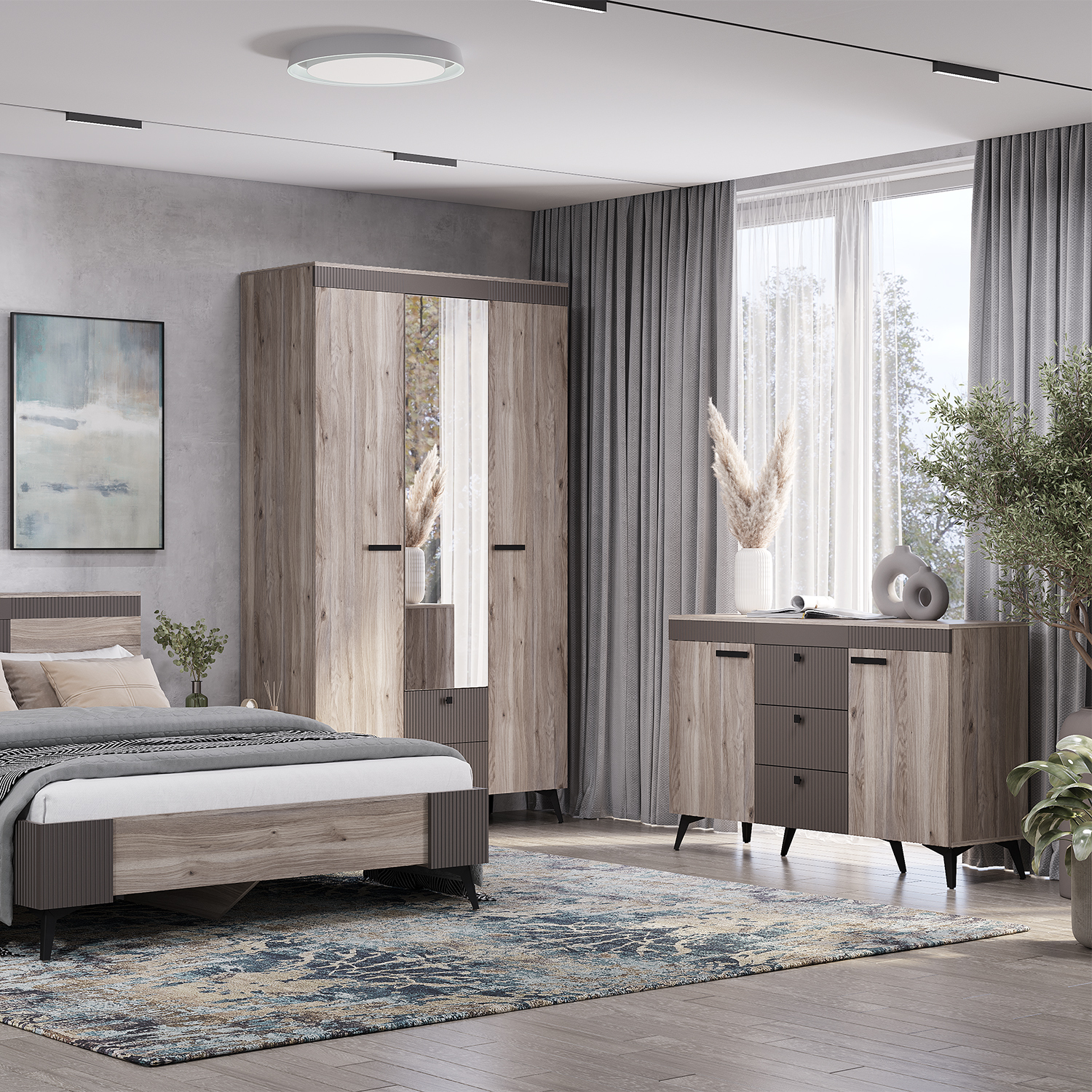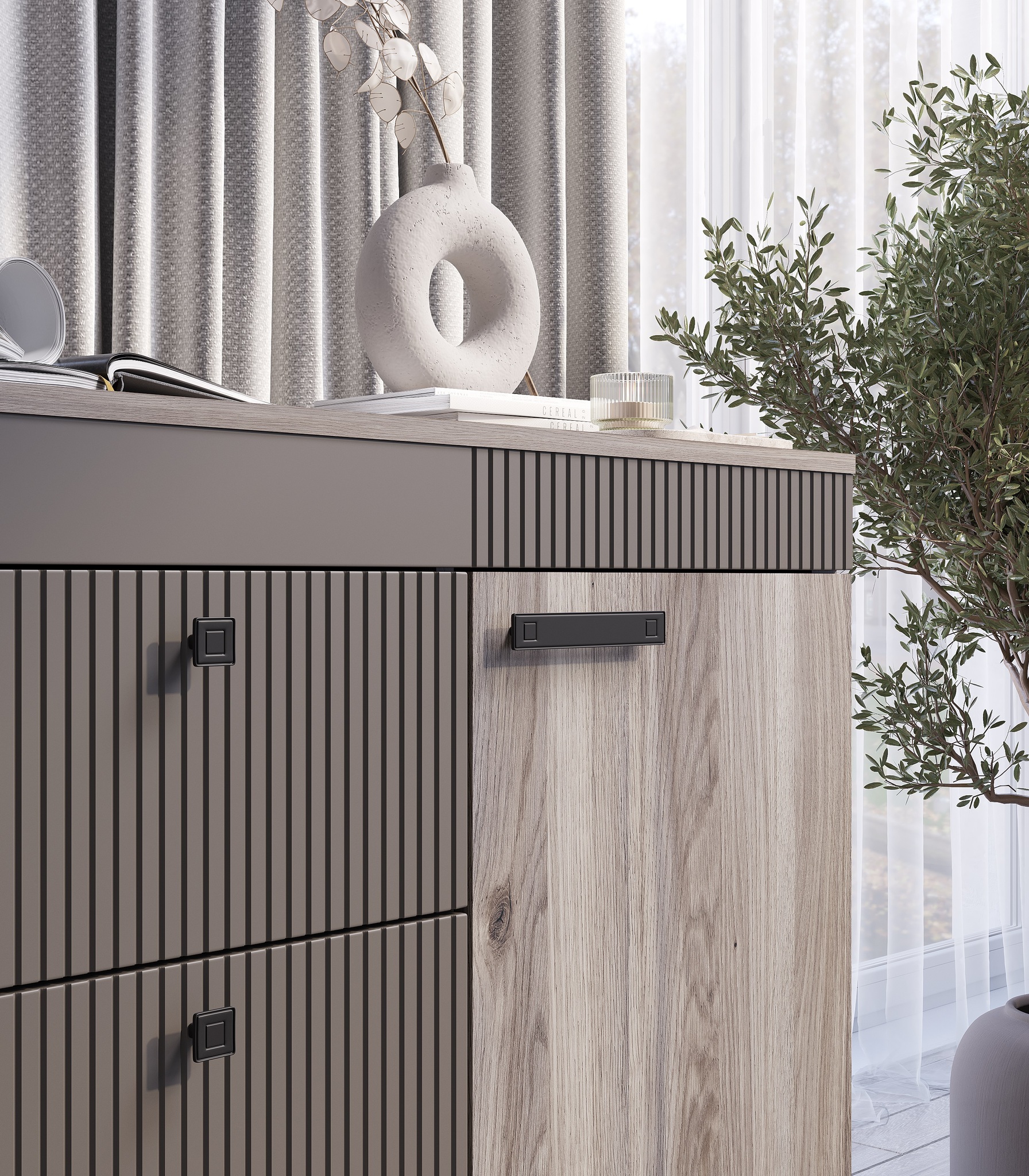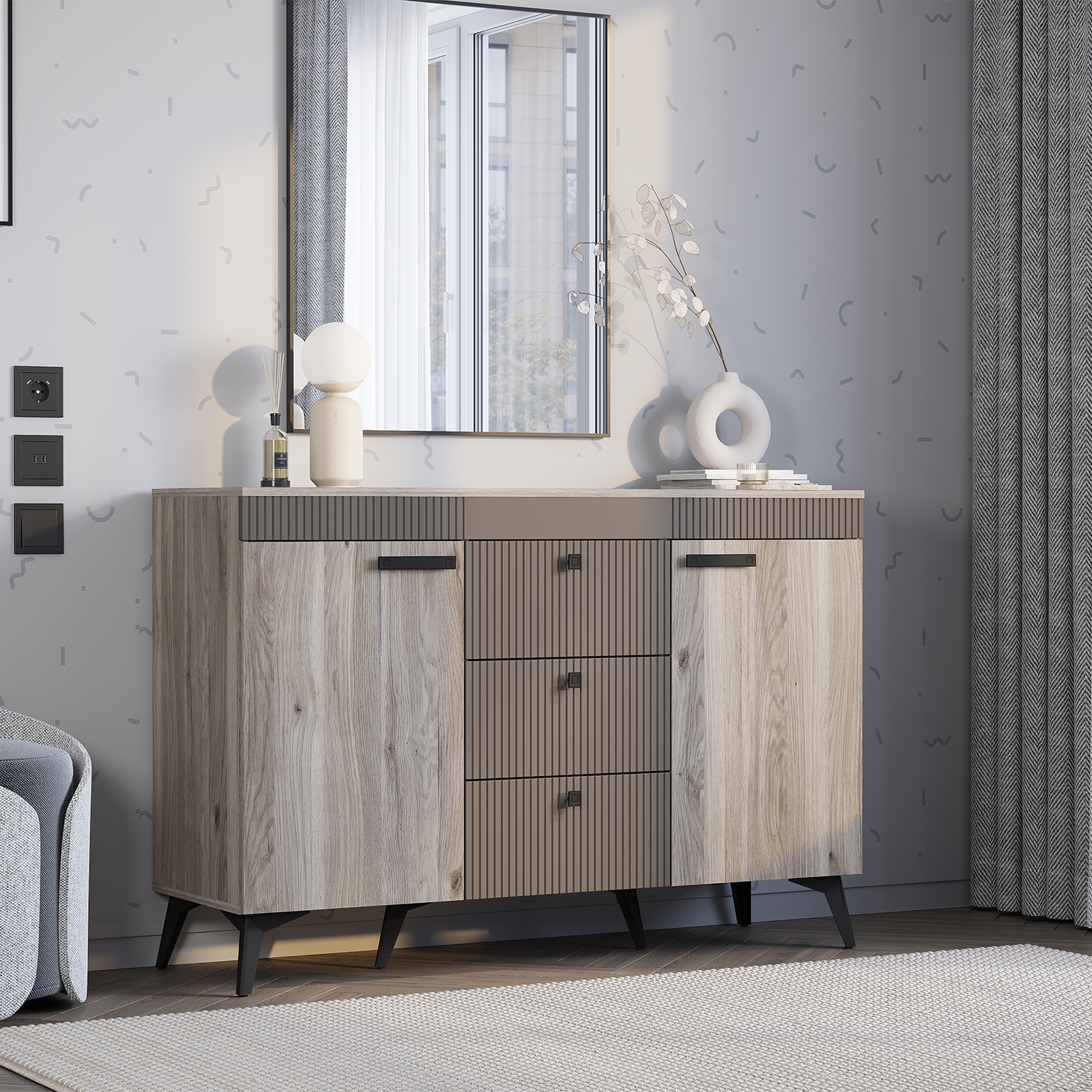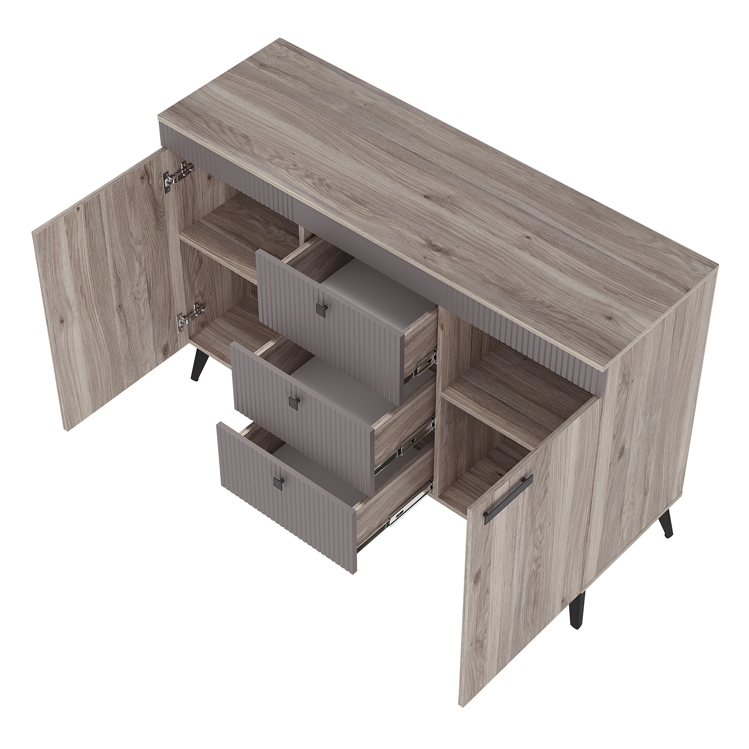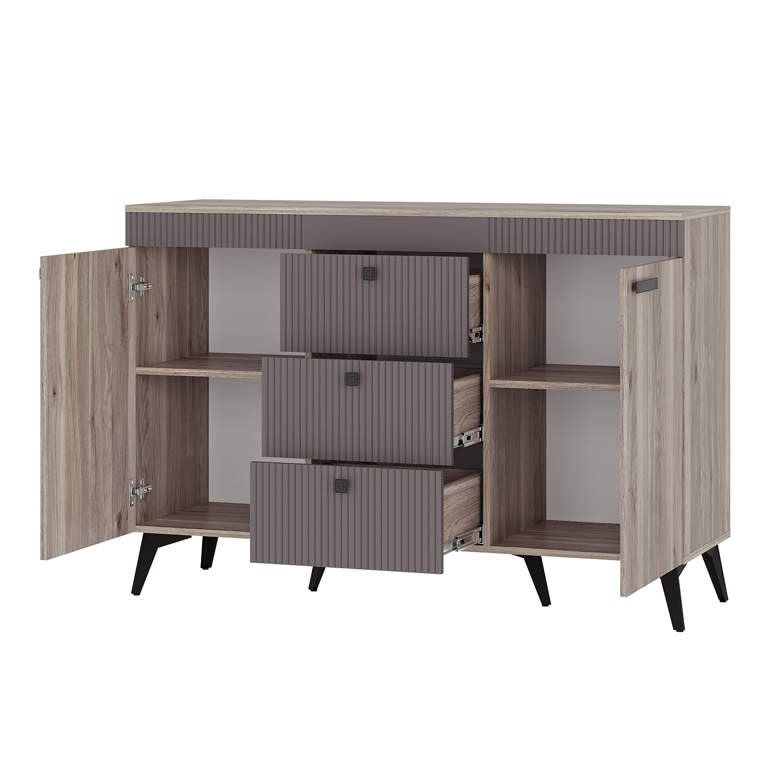 Комод «Кассандра» состоит из трёх вместительных зон: 2 боковые зоны с полками, а центральная состоит из трёх ящиков, в которых удобно хранить постельное бельё и мелочи.