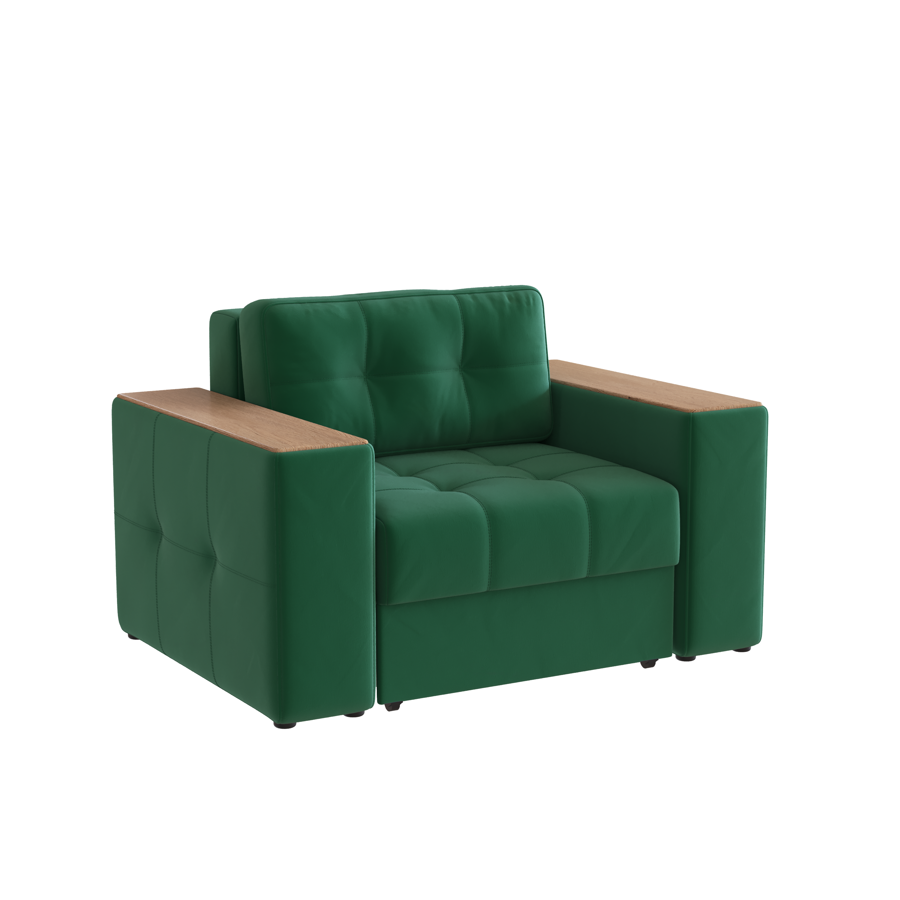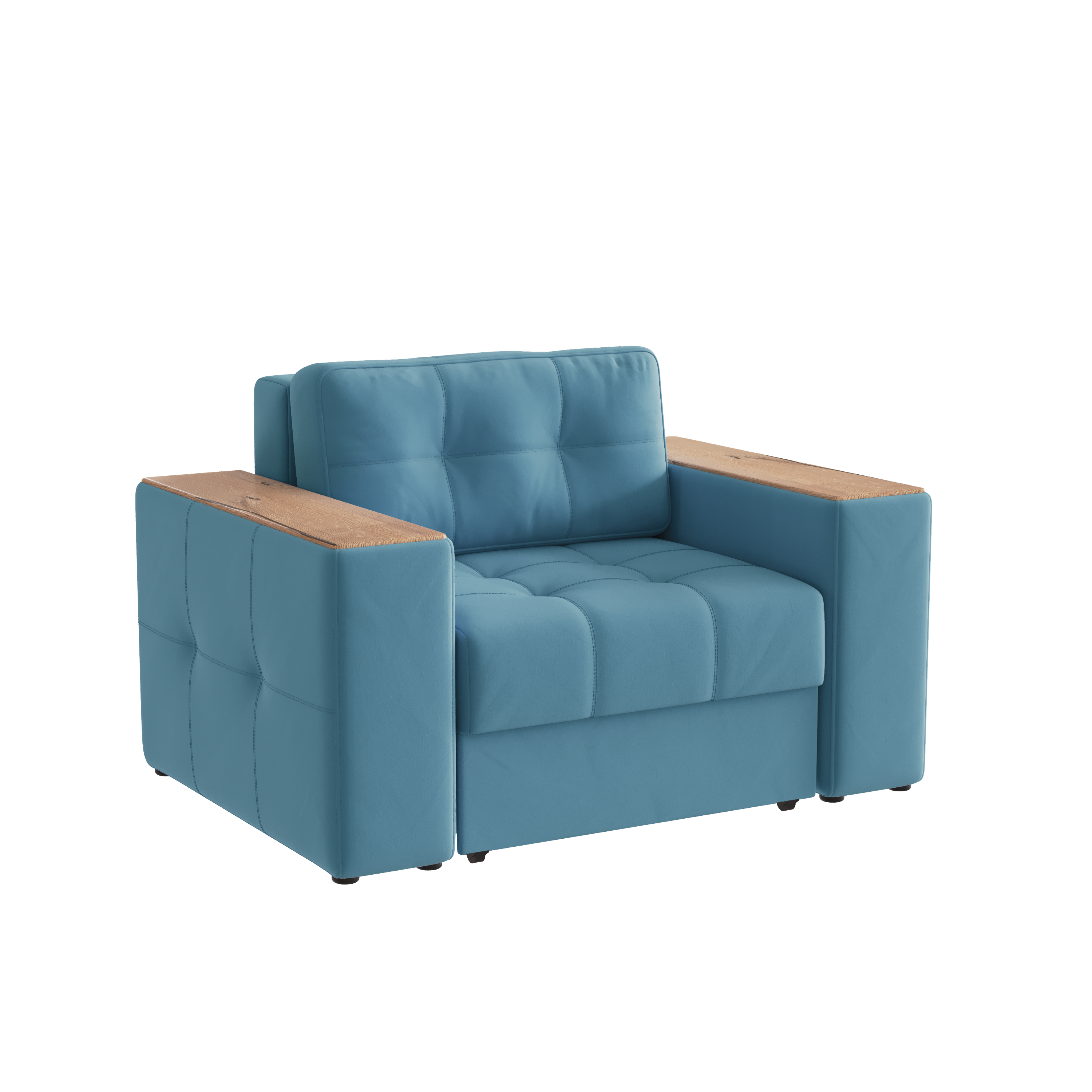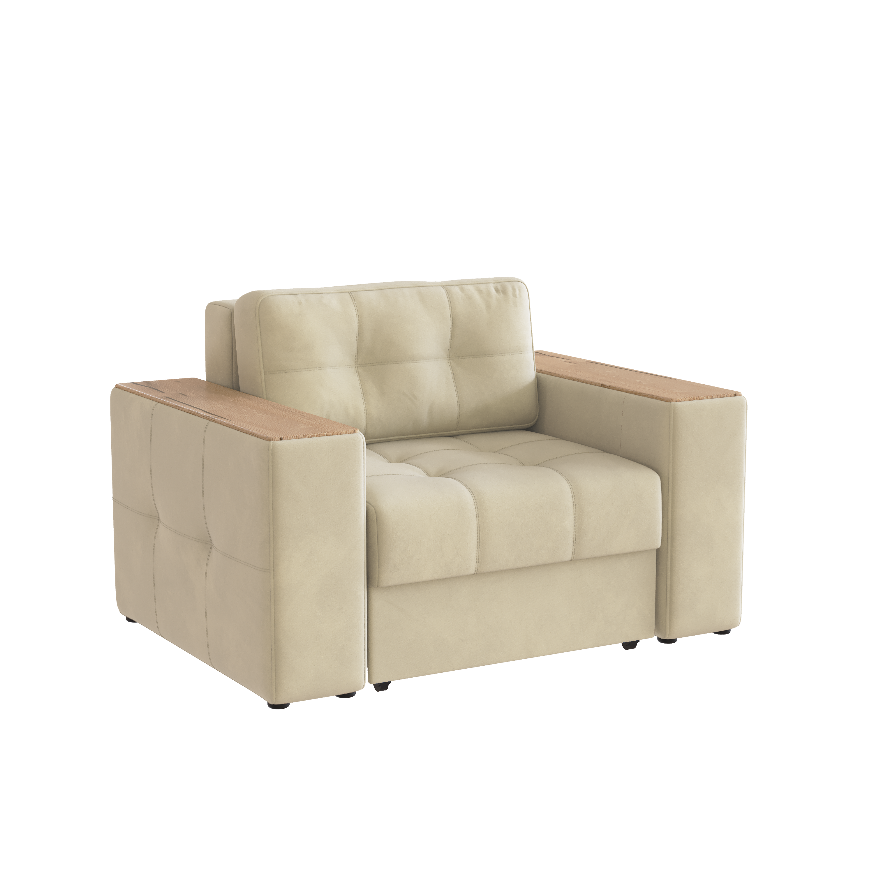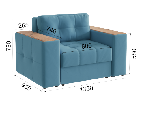 Обивочный материал- двухслойный плотный велюр, с водоотталкивающим покрытием.Подлокотники шириной 265мм,обтянутые тканью и простёганные двойной отделочной декоративной строчкой. Верхняя часть выполнена из МДФ-плиты в матовой пленкой ПВХ. Комплекс механизмов трансформации позволяют превратить кресло в полноценное спальное место с габаритами 800х2080.