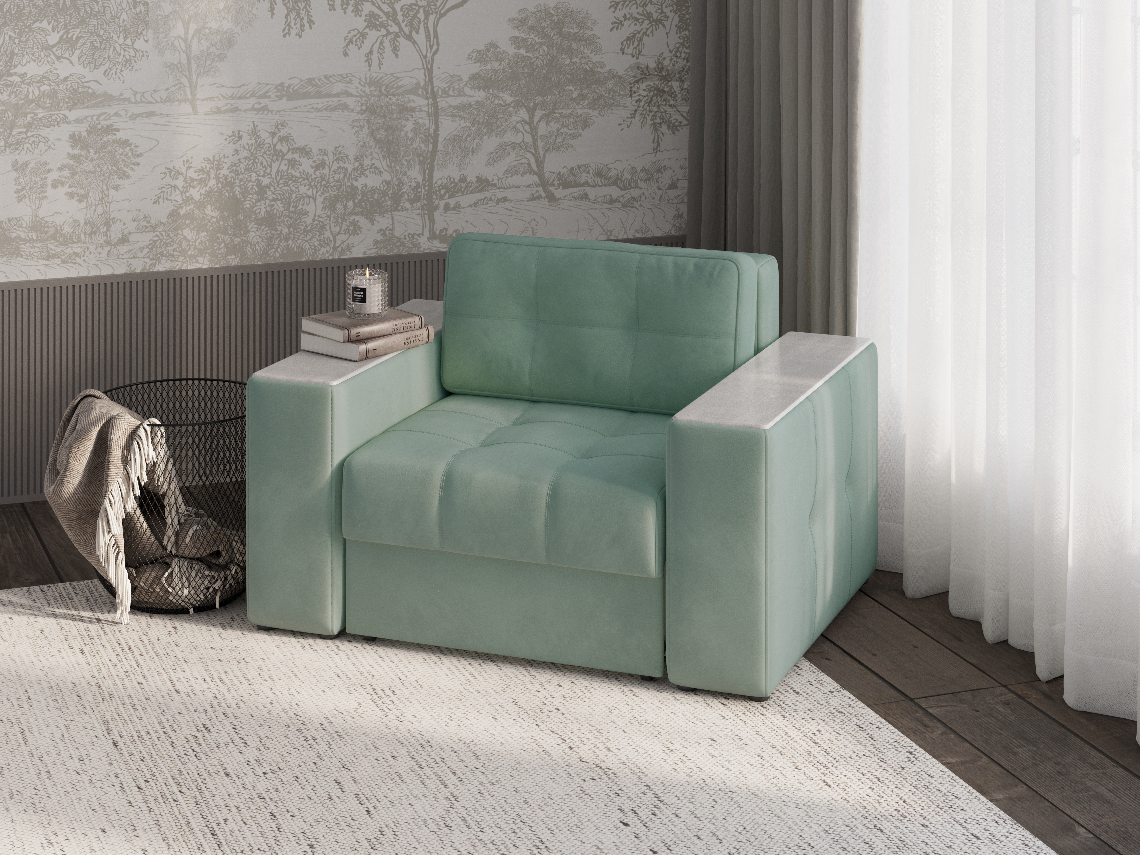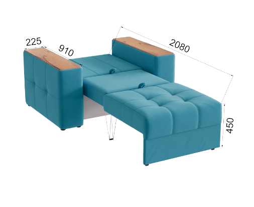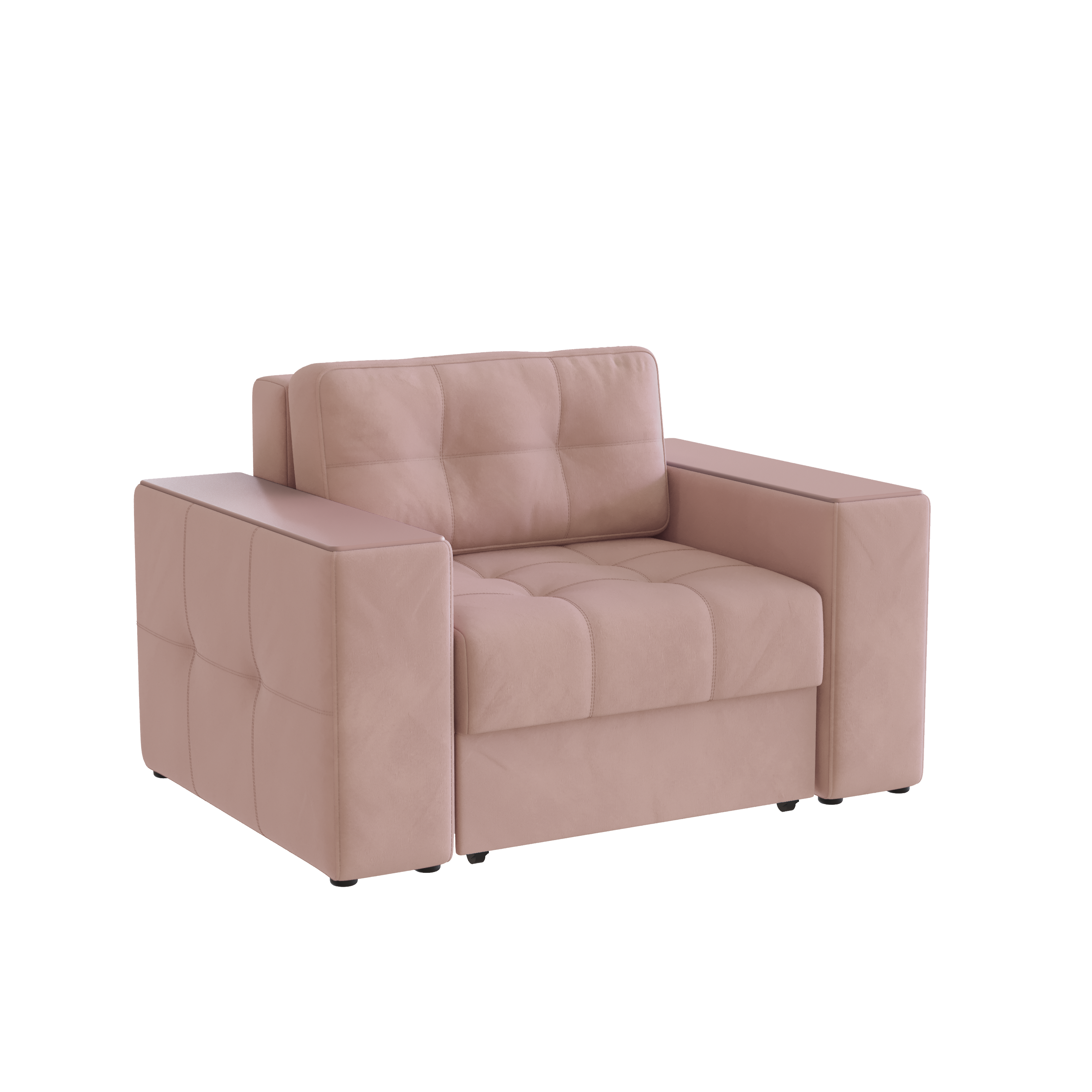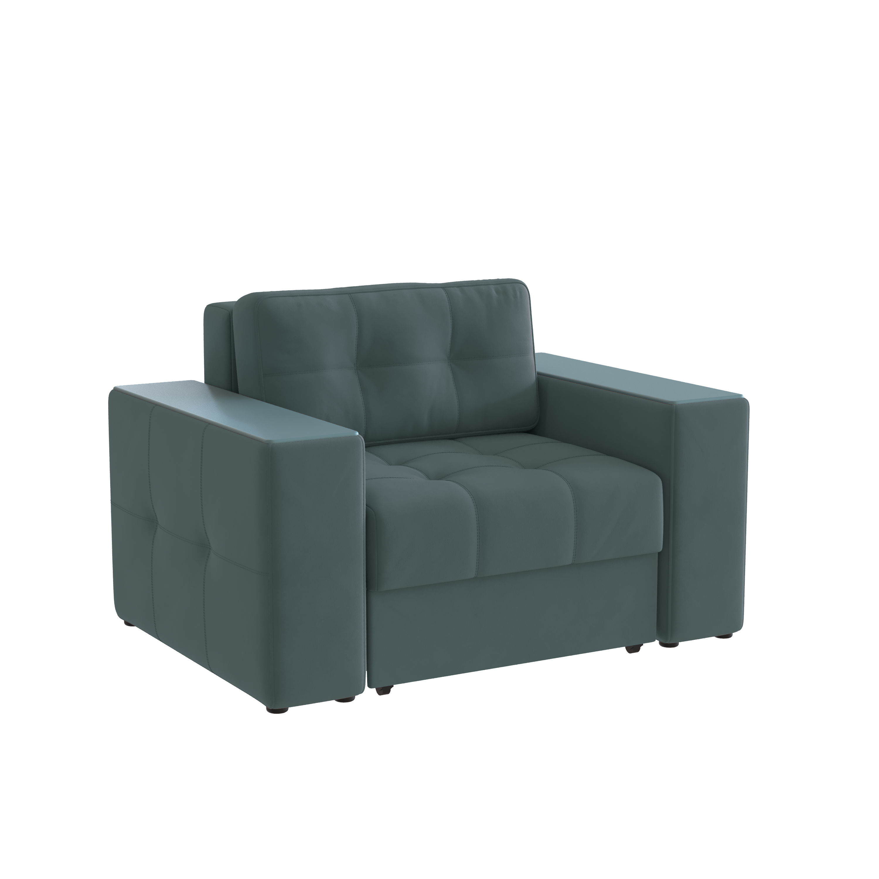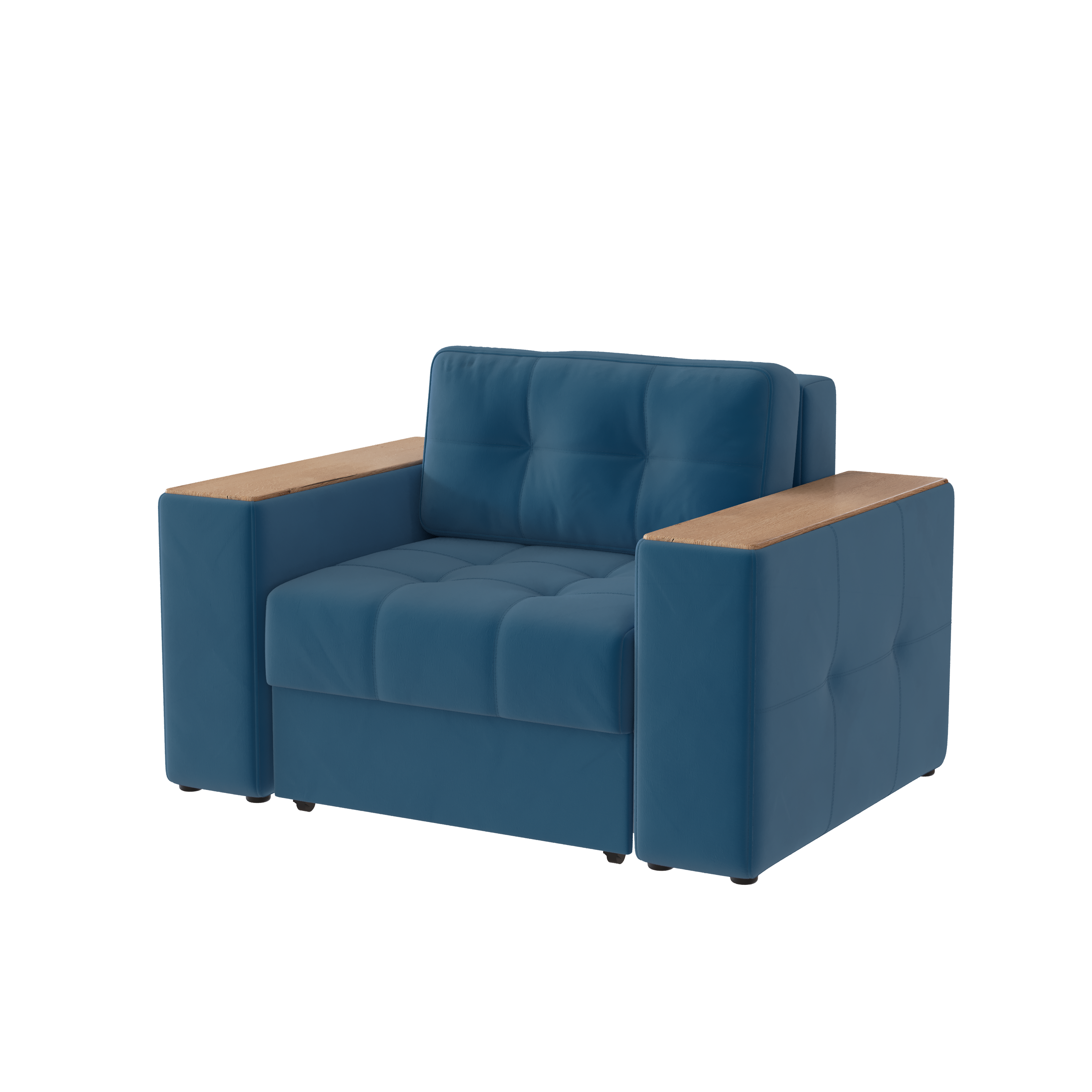 Обивочный материал- двухслойный плотный велюр, с водоотталкивающим покрытием.Подлокотники шириной 265мм,обтянутые тканью и простёганные двойной отделочной декоративной строчкой. Верхняя часть выполнена из МДФ-плиты в матовой пленкой ПВХ. Комплекс механизмов трансформации позволяют превратить кресло в полноценное спальное место с габаритами 800х2080.
