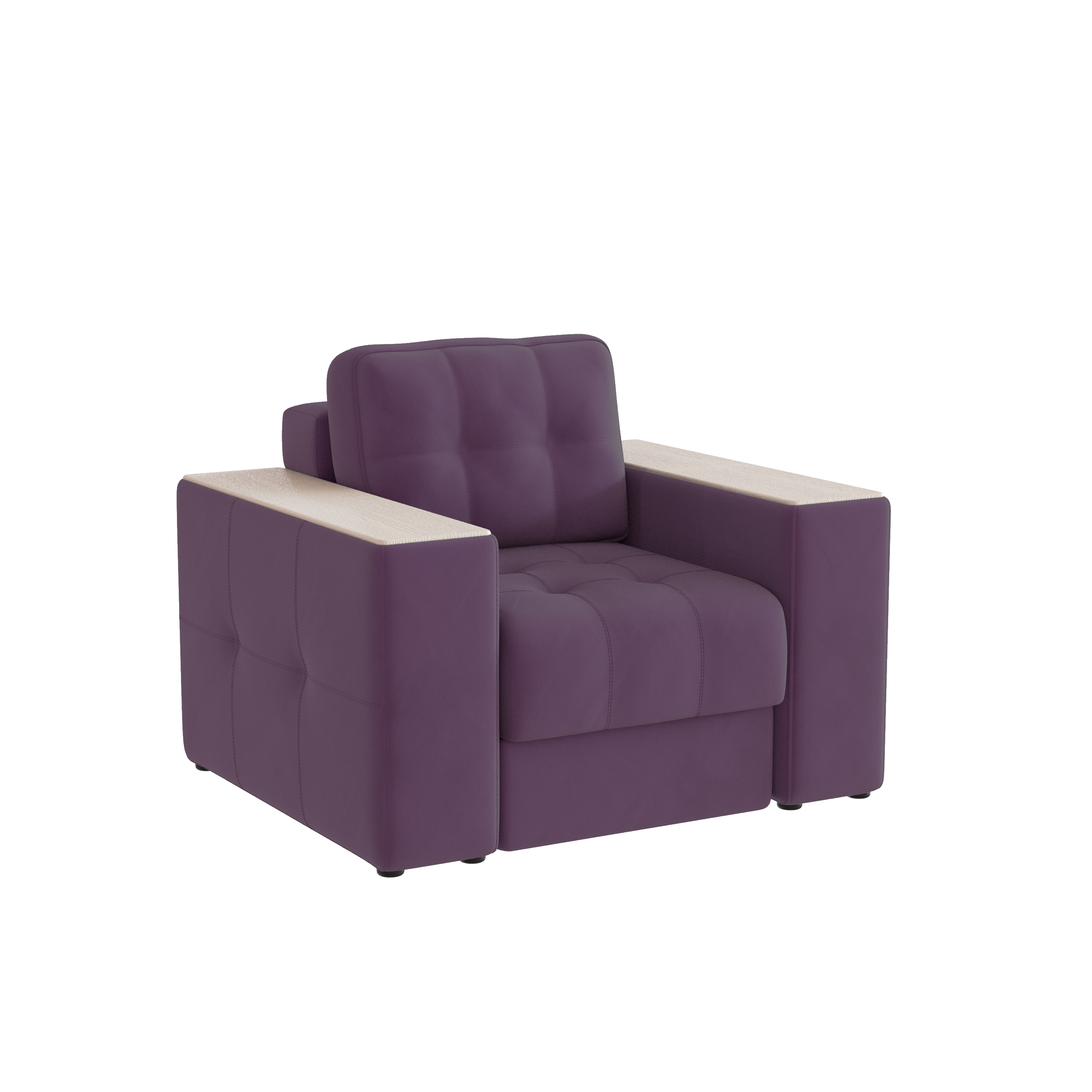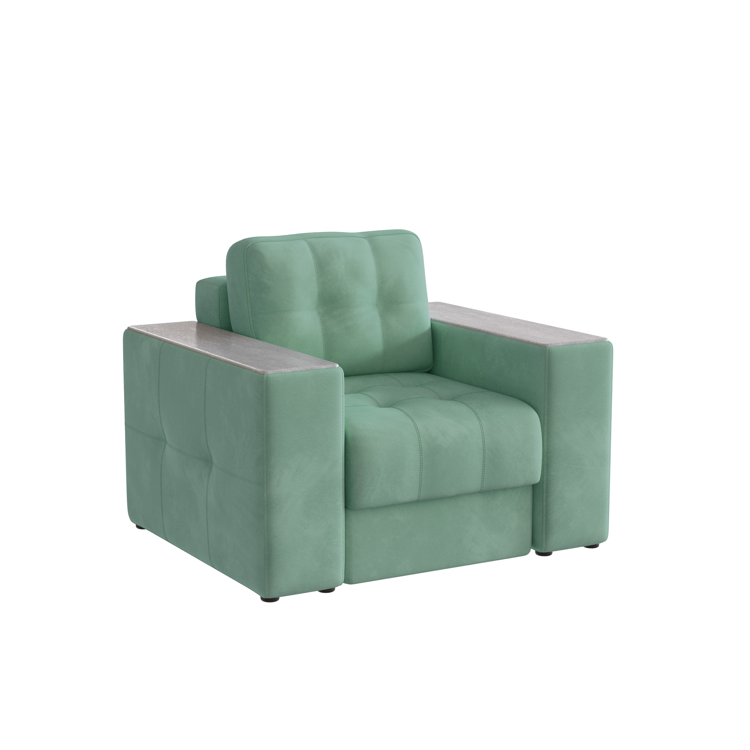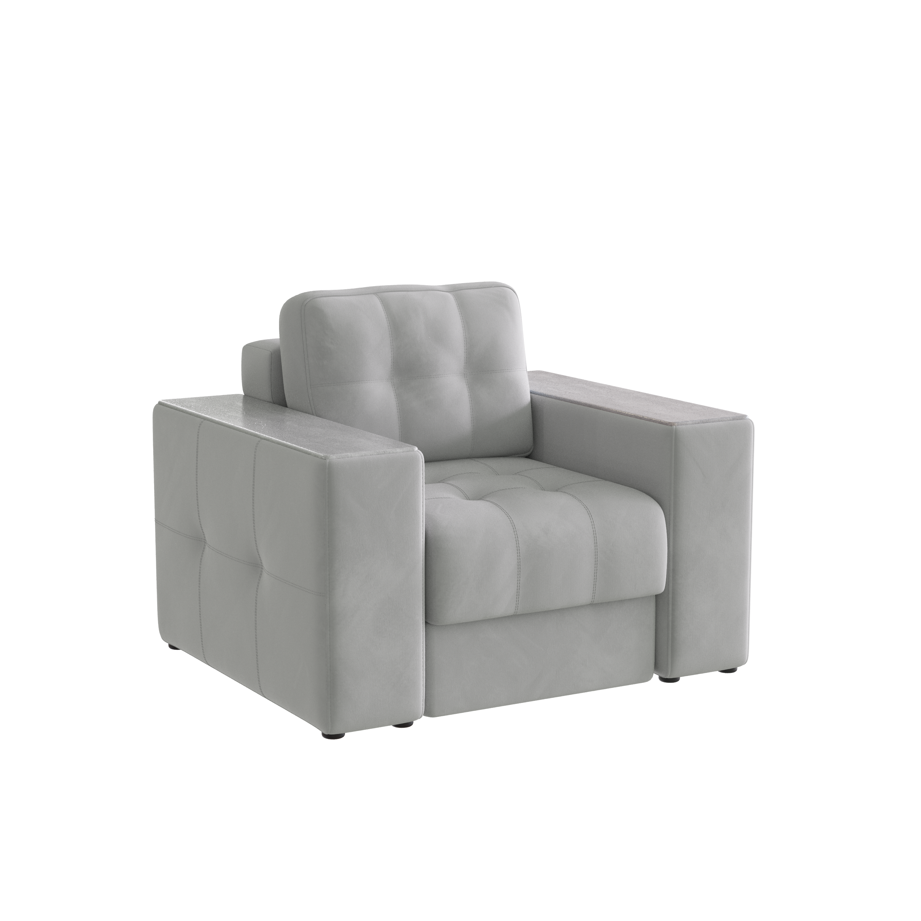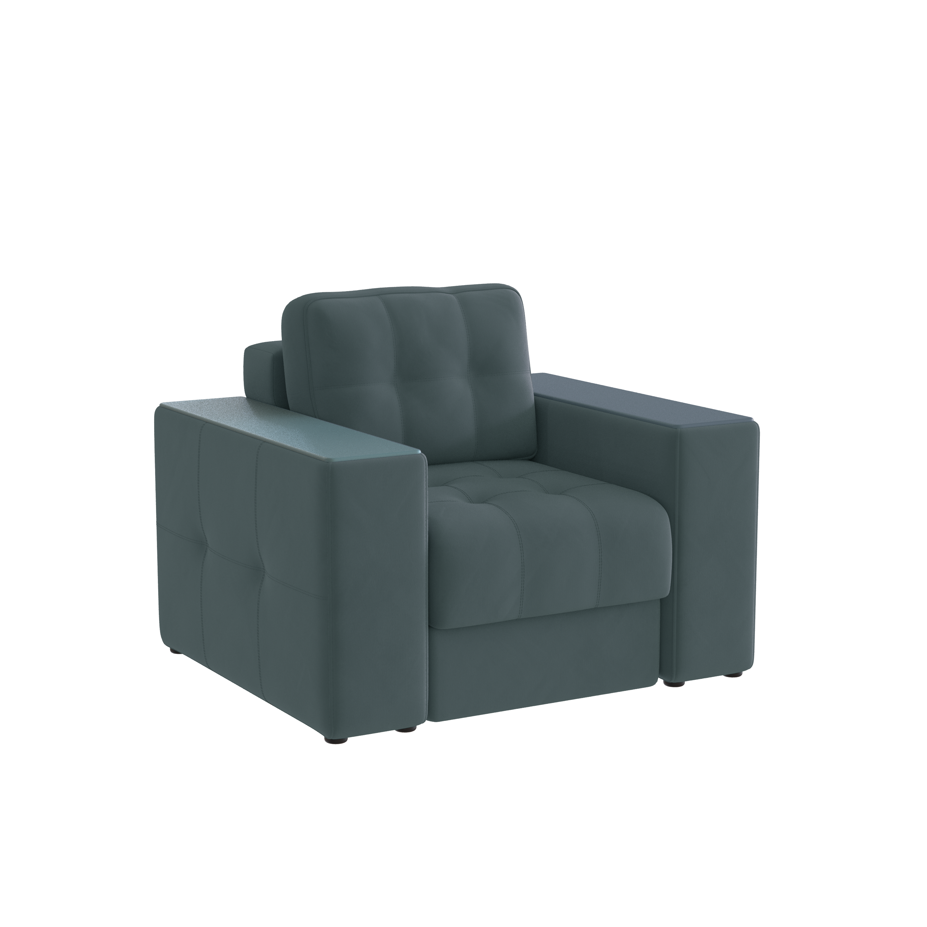 Обивочный материал- двухслойный плотный велюр, с водоотталкивающим покрытием. Подлокотники шириной 265мм,обтянутые тканью и простёганные двойной отделочной декоративной строчкой. Верхняя часть выполнена из МДФ-плиты в матовой пленкой ПВХ. Комплектуется чёрными пластиковыми круглыми опорами высотой 25 мм и металлическими опорами трубами шириной 150мм. .