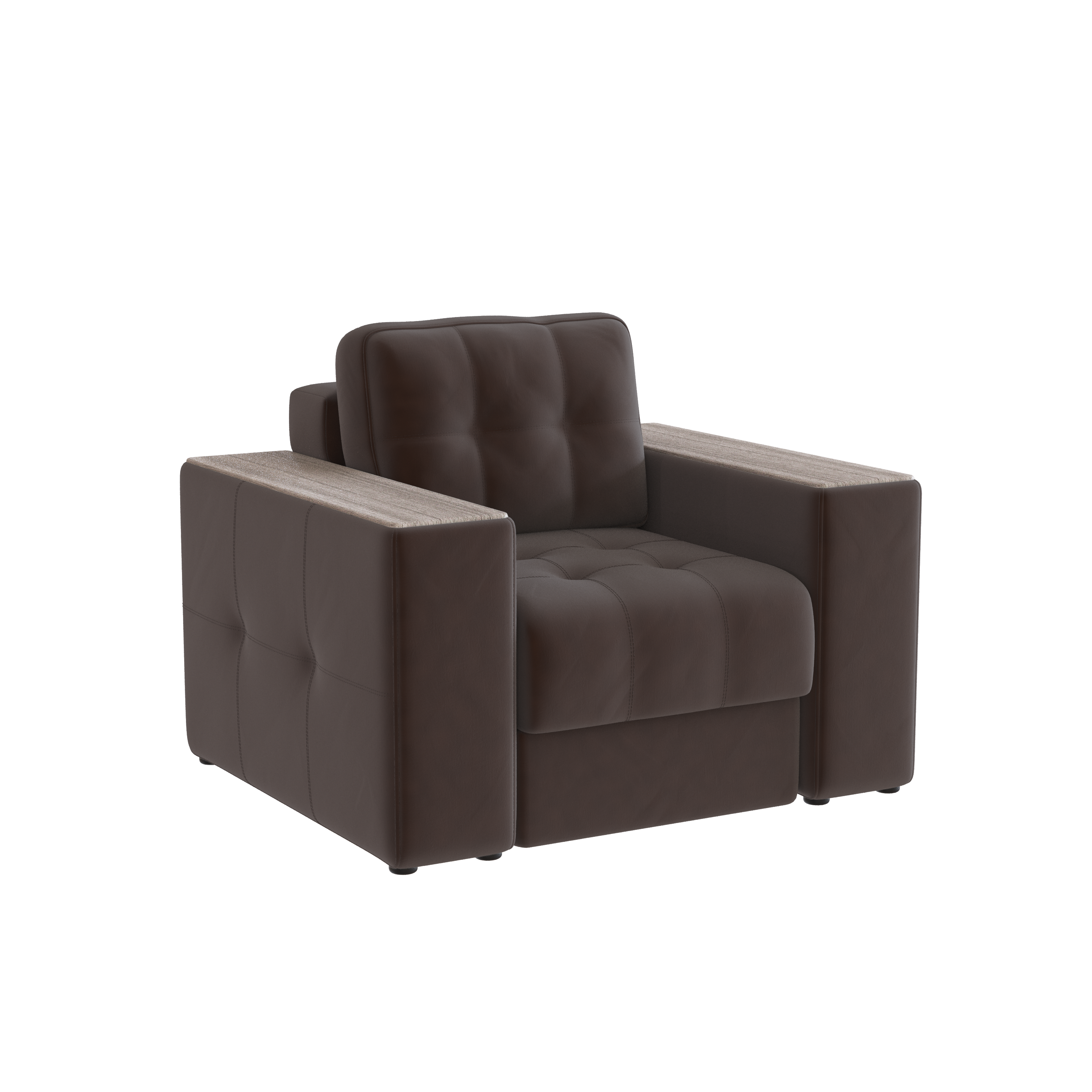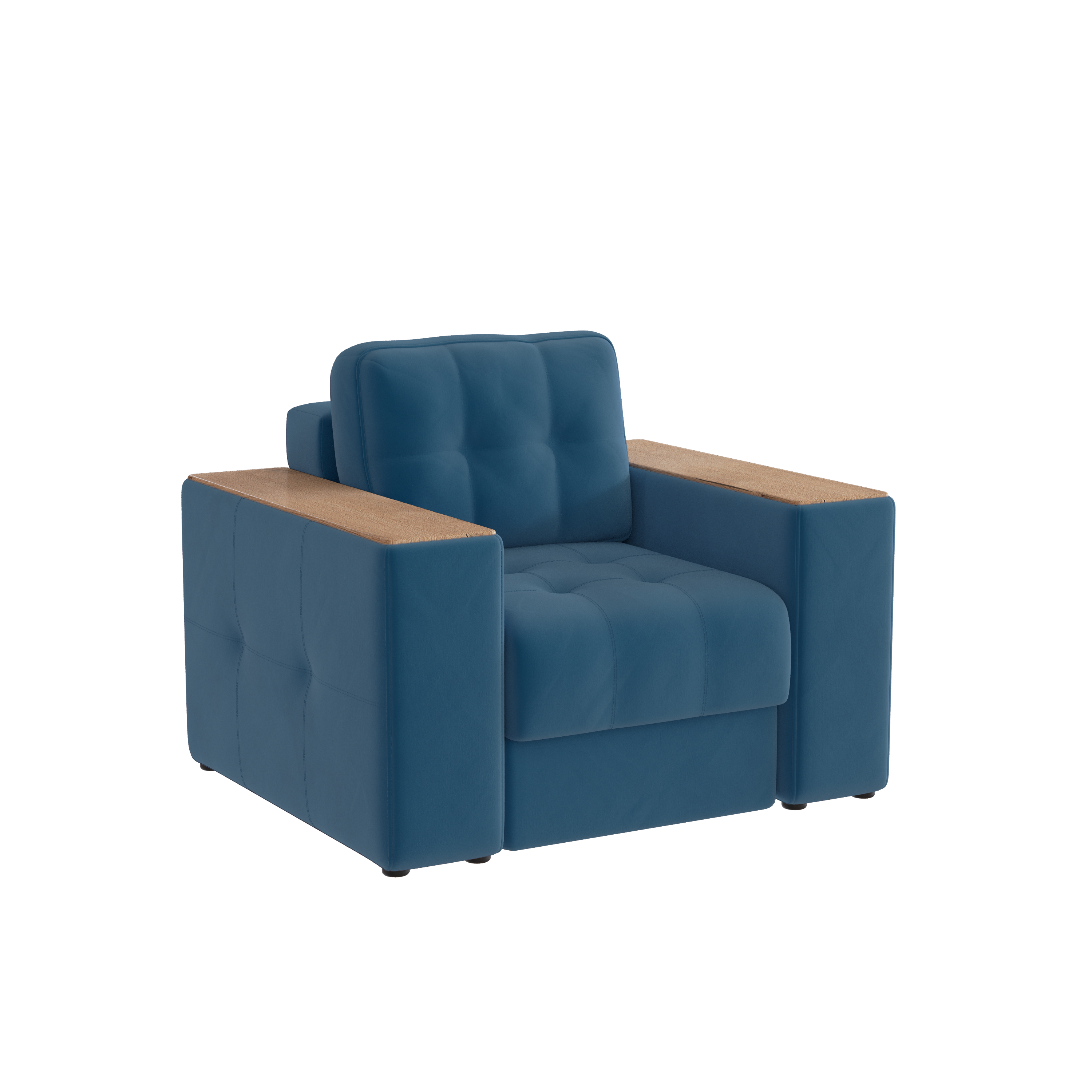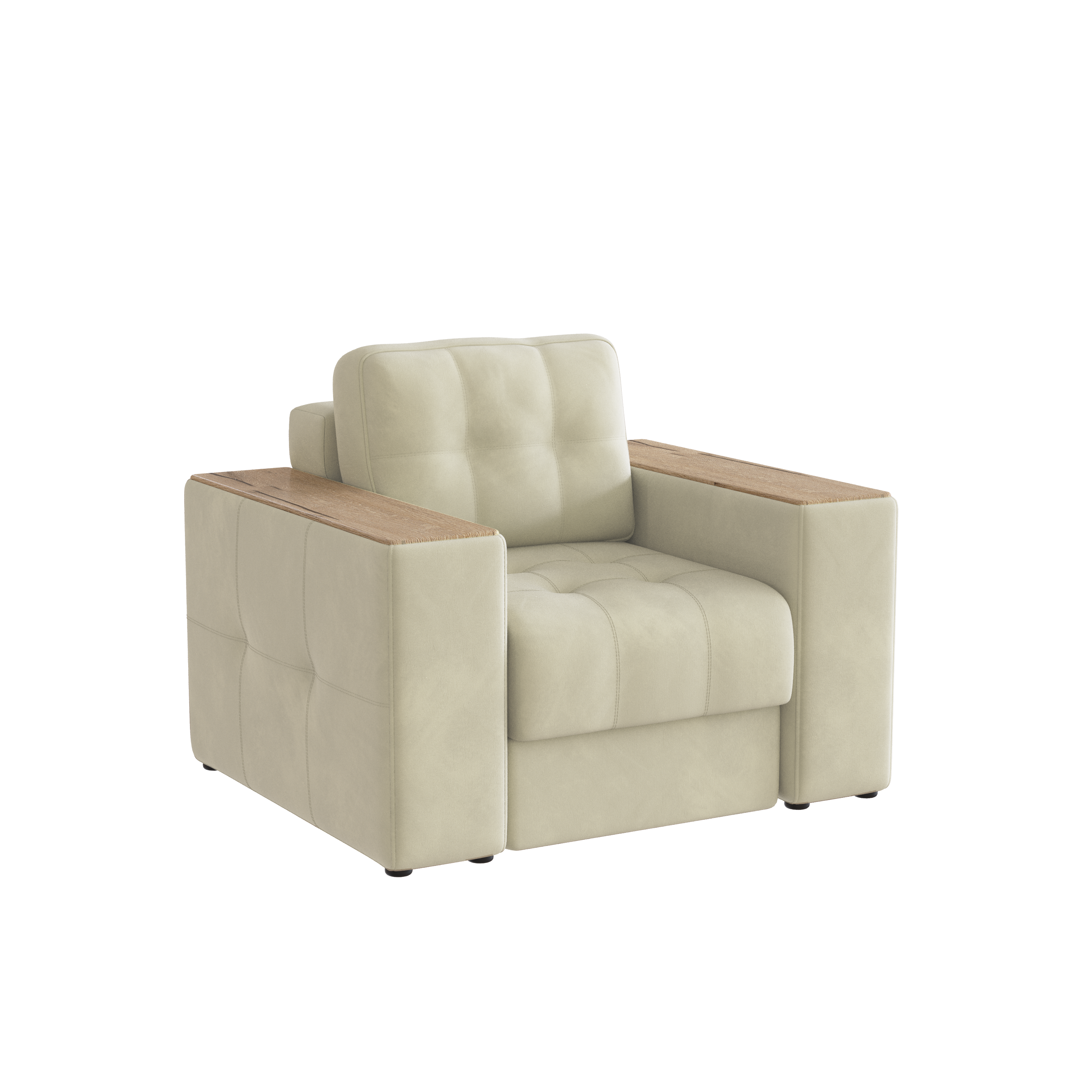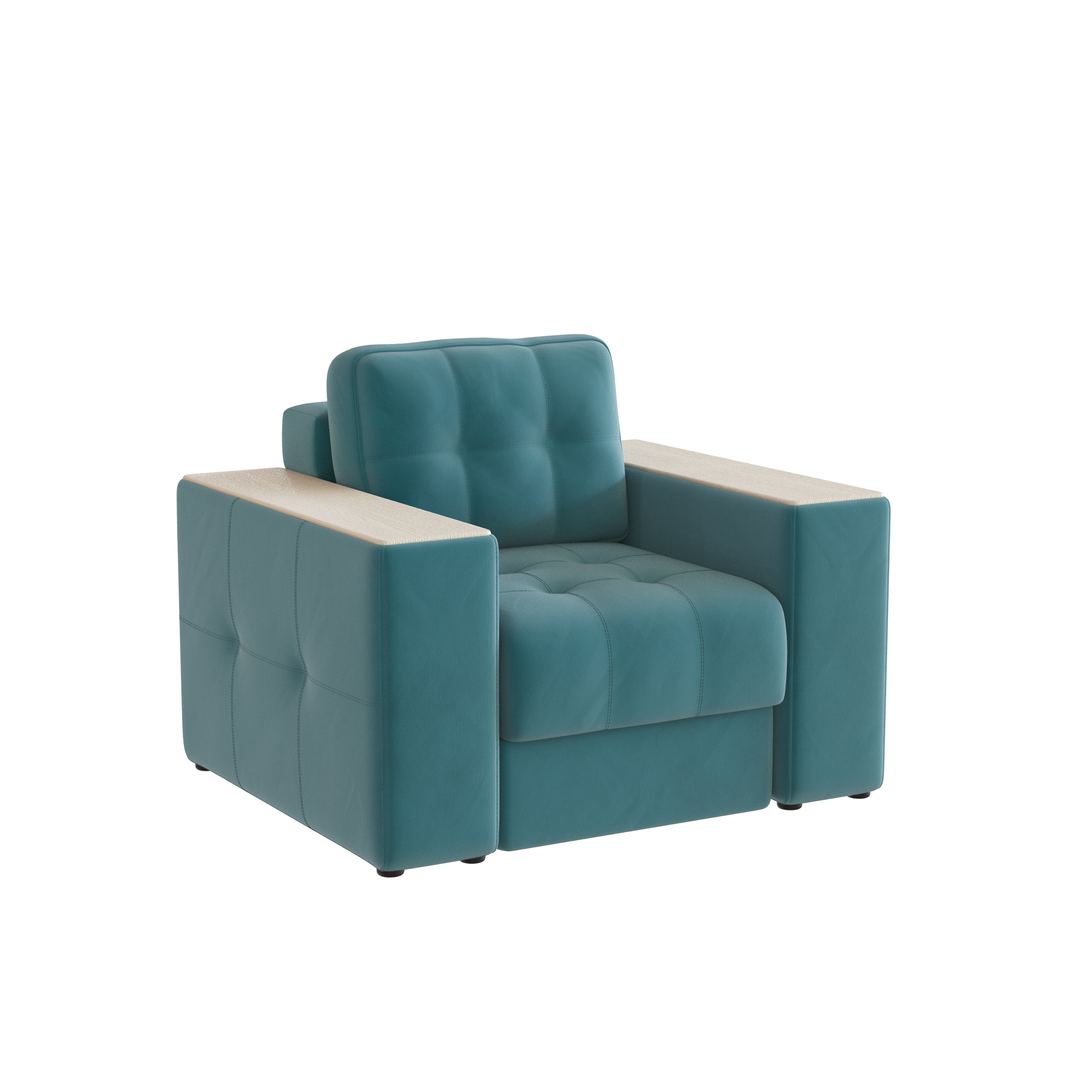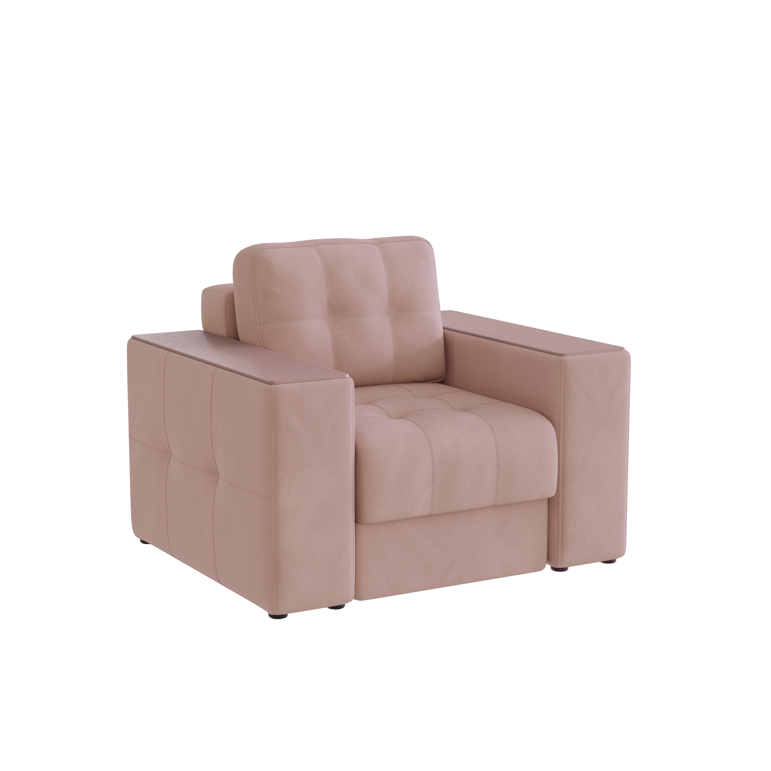 Обивочный материал- двухслойный плотный велюр, с водоотталкивающим покрытием. Подлокотники шириной 265мм,обтянутые тканью и простёганные двойной отделочной декоративной строчкой. Верхняя часть выполнена из МДФ-плиты в матовой пленкой ПВХ. Комплектуется чёрными пластиковыми круглыми опорами высотой 25 мм и металлическими опорами трубами шириной 150мм. .
