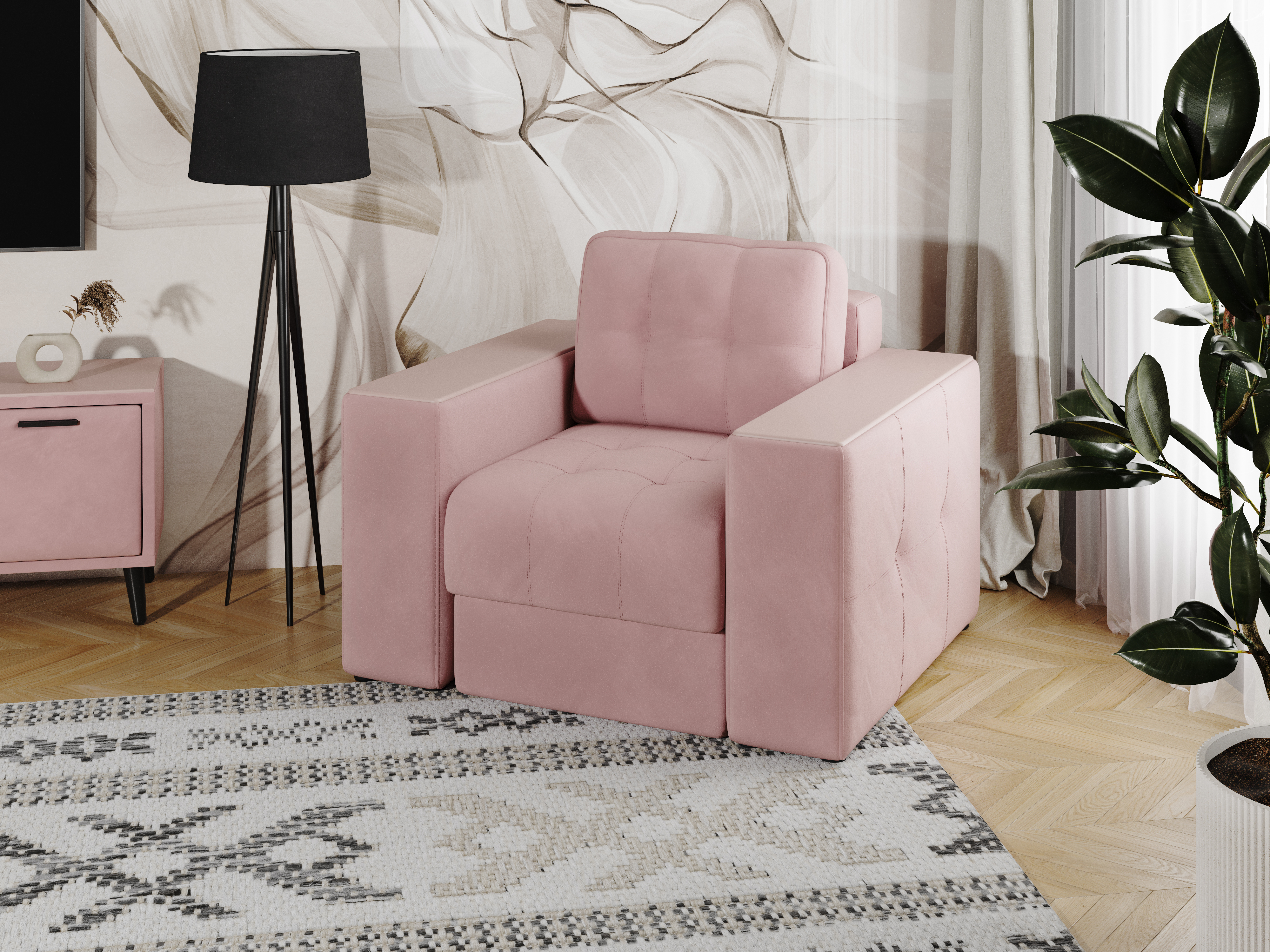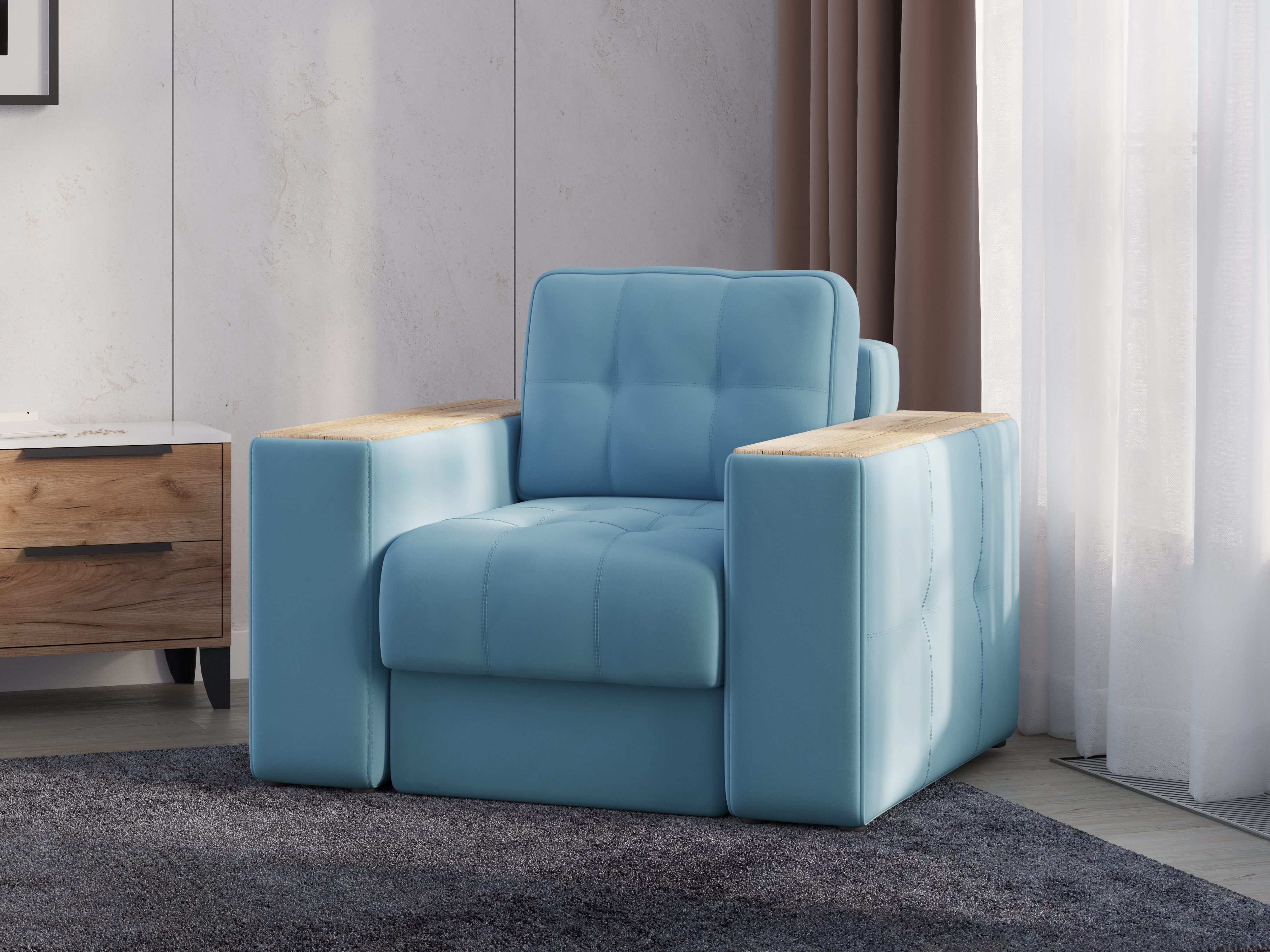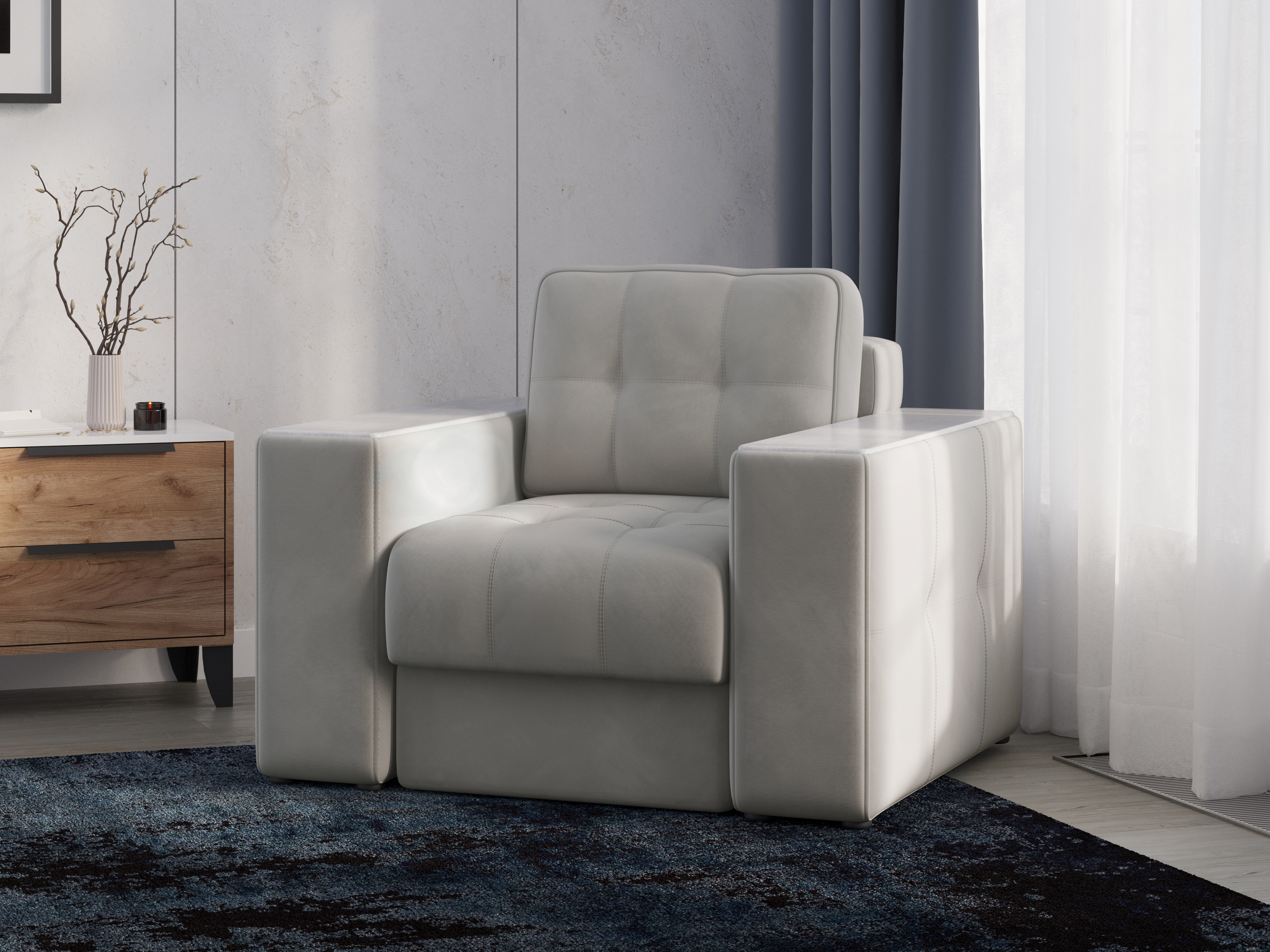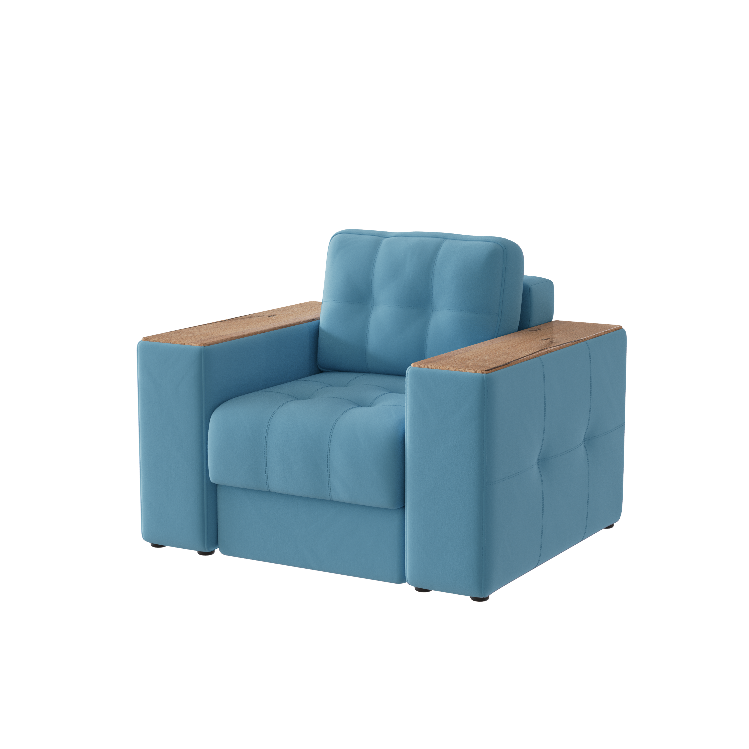 Обивочный материал- двухслойный плотный велюр, с водоотталкивающим покрытием. Подлокотники шириной 265мм,обтянутые тканью и простёганные двойной отделочной декоративной строчкой. Верхняя часть выполнена из МДФ-плиты в матовой пленкой ПВХ. Комплектуется чёрными пластиковыми круглыми опорами высотой 25 мм и металлическими опорами трубами шириной 150мм. .