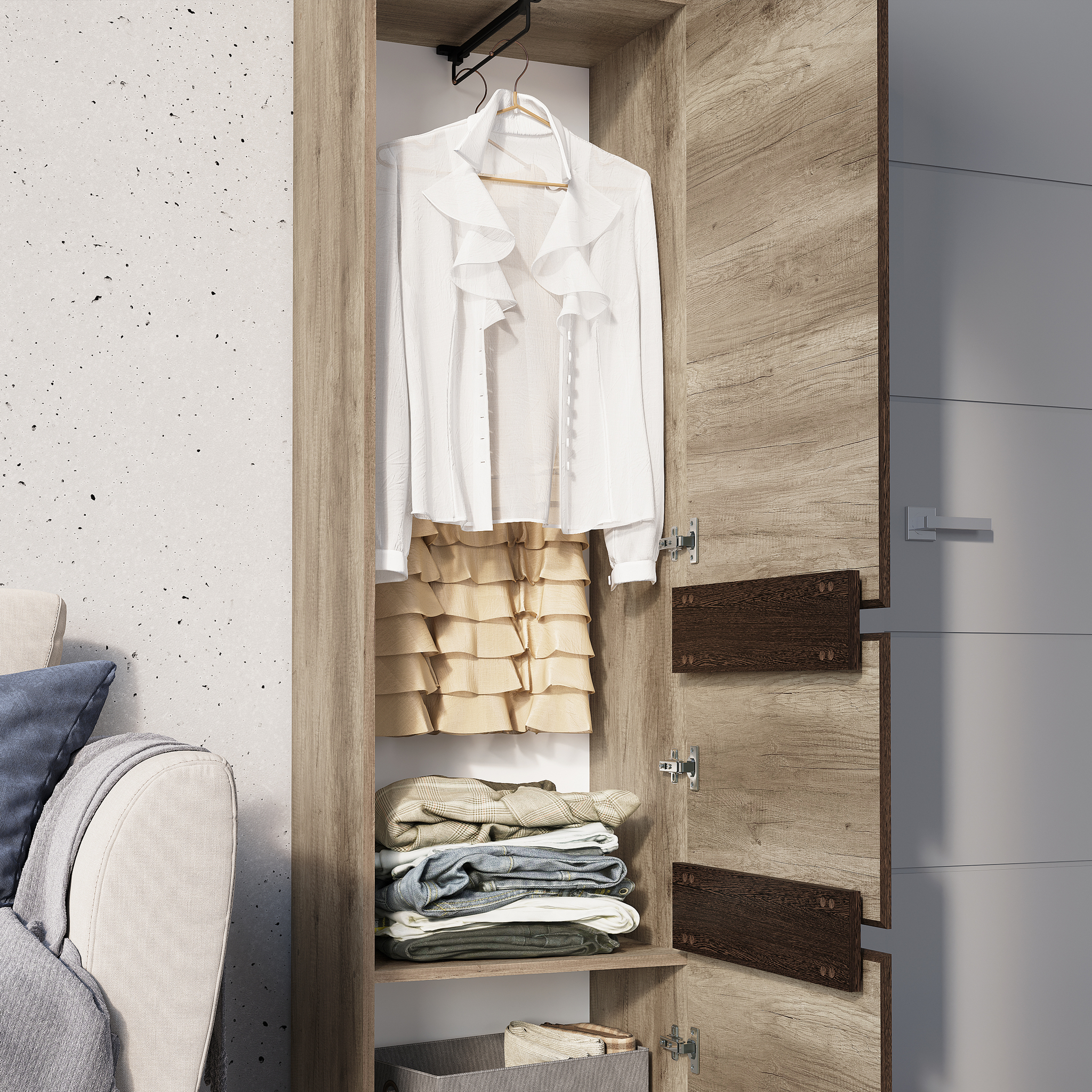 Компактный и вместительный пенал «Энигма» — универсальное решение для вашего дома. Модель подойдёт для спальни, гостиной и прихожей. Пенал состоит из двух просторных полок и отсека с евроштангой выкатной для вертикального хранения. По желанию Вы можете заменить штангу дополнительными полками ПЛ-28. Полки приобретаются отдельно.