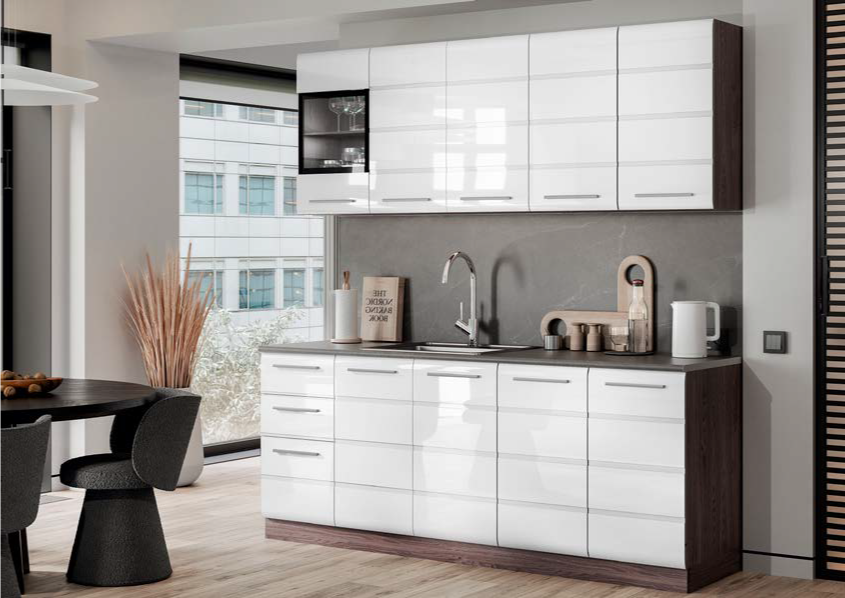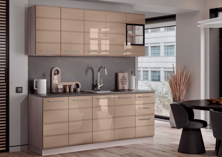 Модульная линейка "Инесса NEW" – это потрясающее произведение мебельной индустрии, яркий представитель современных направлений. Правильные пропорции, глянцевые поверхности фасадов, приятные мягкие цветовые оттенки – все это облегчает визуальное восприятие, придает легкости интерьеру, насыщает помещение светом и теплом. Особенность коллекции – разновысокие модули, навесные элементы открытого и закрытого типа. Еще одно отличие – скошенные фасады шкафов, что зрительно смягчает интерьер. В целом модульная линейка позволяет собрать кухонный гарнитур с необходимой функциональностью, нужной ширины и конфигурации. При изготовлении использована высококачественная бесшумная фурнитура, направляющие полного выдвижения, удобные ручки. Некоторые отдельные верхние модули имеют вставки из матового стекла.