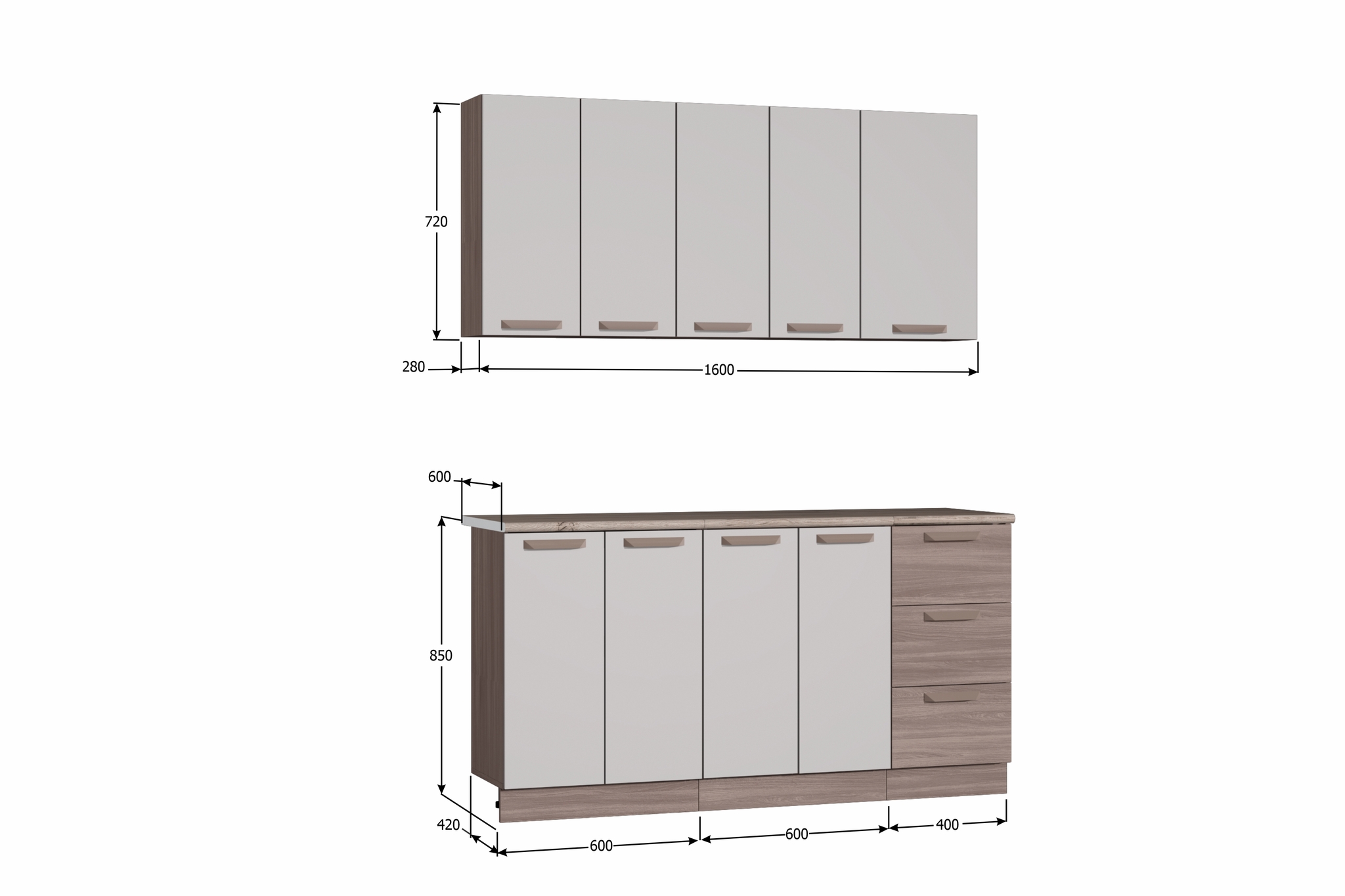 Кухня длиной 160 см – это компактное и функциональное решение, идеально подходящее для небольших квартир или кухонь. Комплект состоит из мойки шириной 60 см , стола 60 см с дверцами и стола 40 см с ящиками, и верхних навесных шкафов. Цветовая гамма, сочетающая тёмный шимо для корпуса и кашемир для фасадов, создает элегантный и современный вид, где нейтральные оттенки гармонично сочетаются, придавая кухне уют и стиль.