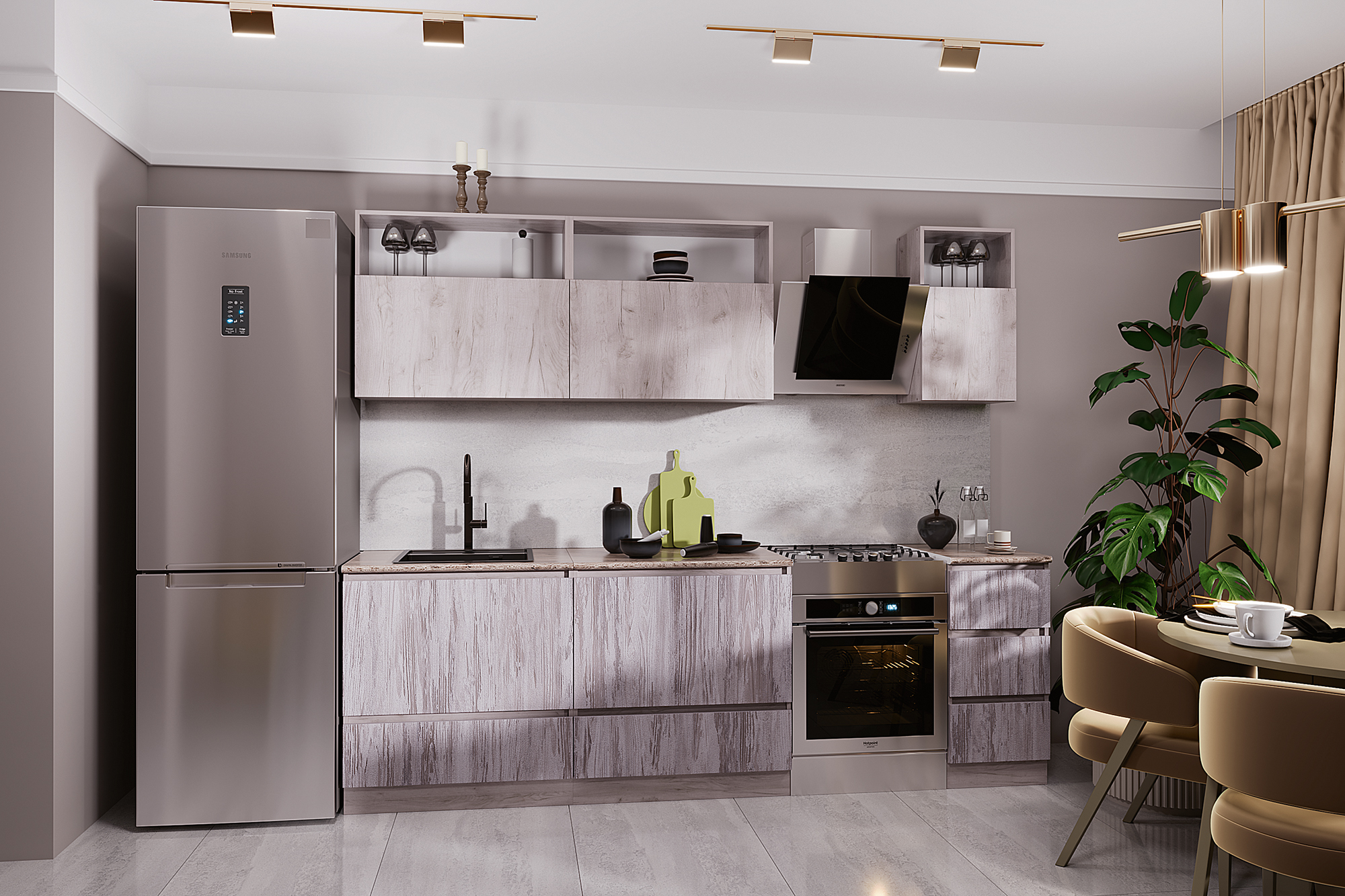 - Кухня укомплектована двумя столешницами по 800мм и одной 400мм, толщиной 26мм. Столешница - дуб кера.