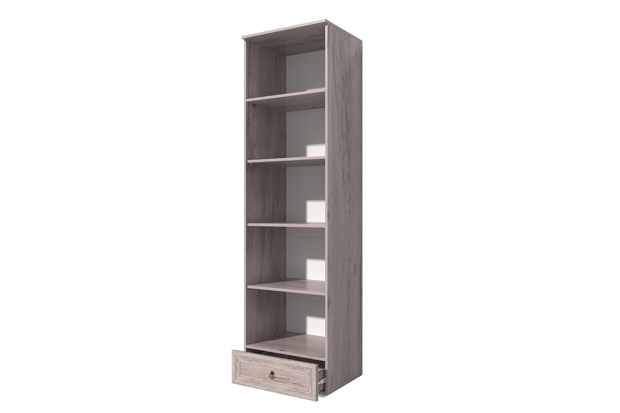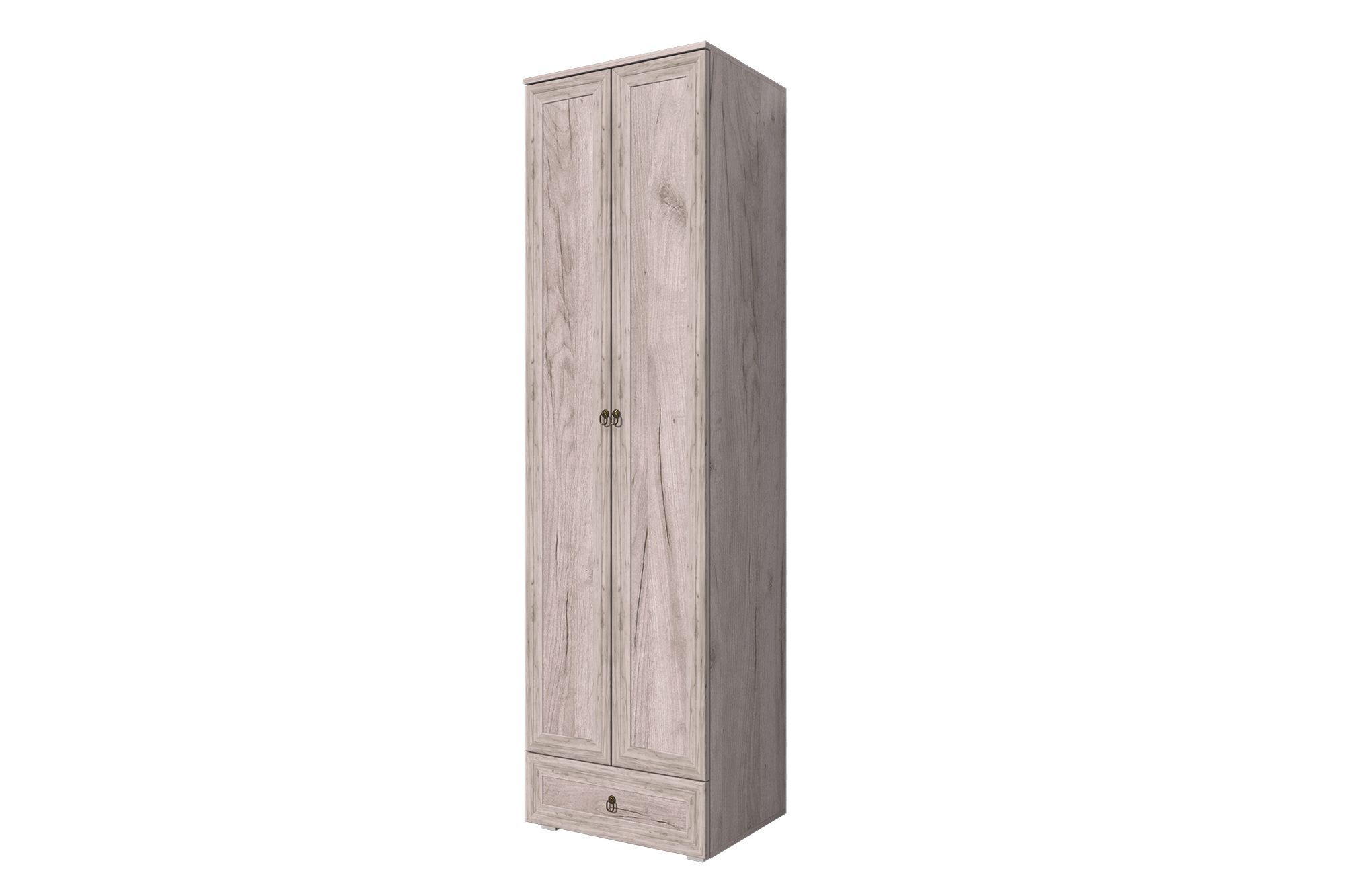 Шкаф 600 является одним из элементов модульной системы "Алисия". Шкаф сочетает в себе выдвижной ящик на шариковых направляющих и полки для хранения вещей. Металлические ручки "Кольцо" бронзового цвета с патиной.