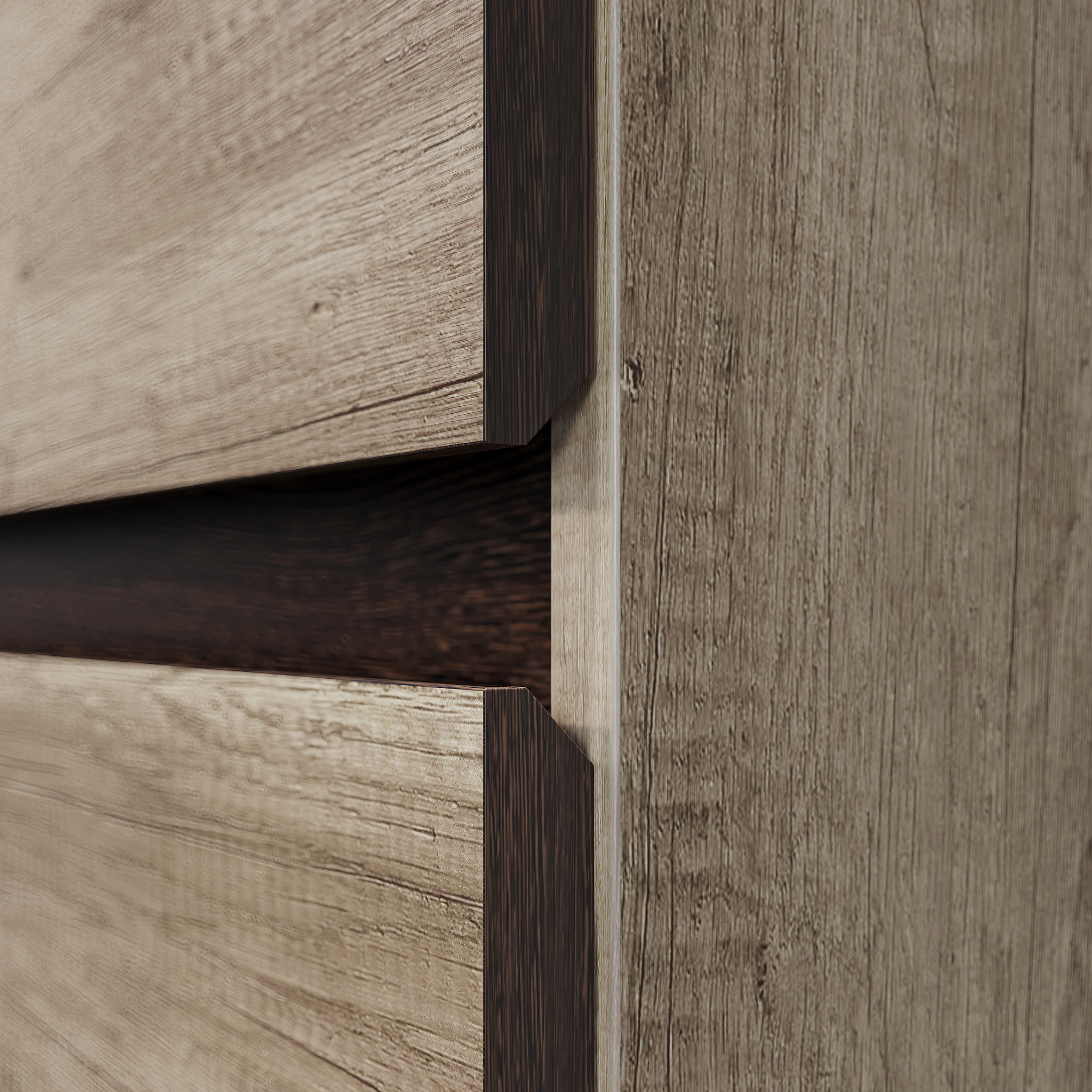 Толщина кромки – 0,4 мм. «Дуб каньон» кромится в цвет корпуса. Фасадные части цвета «дуб каньон» кромятся цветом «венге».