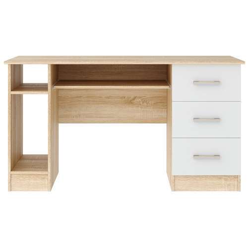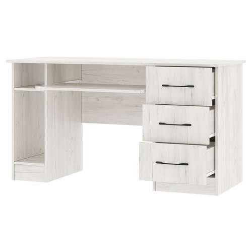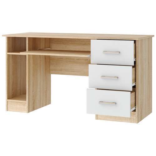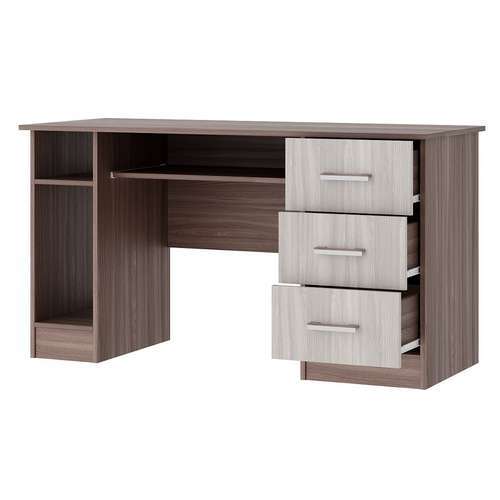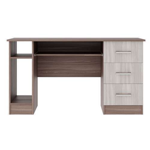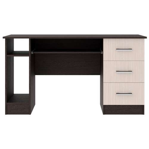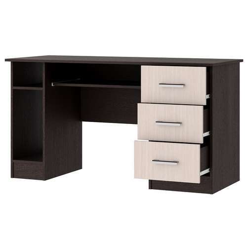 Письменно-компьютерный стол ПКС-4 с нишей для системного блока, с 3-мя ящиками и выдвижной полкой на роликовых направляющих. Столешница обработана кромкой толщиной 1 мм, что делает работу за столом более комфортной и удобной. Чёрная матовая металлическая ручка. Рабочая зона стола 1384 х 570 мм.