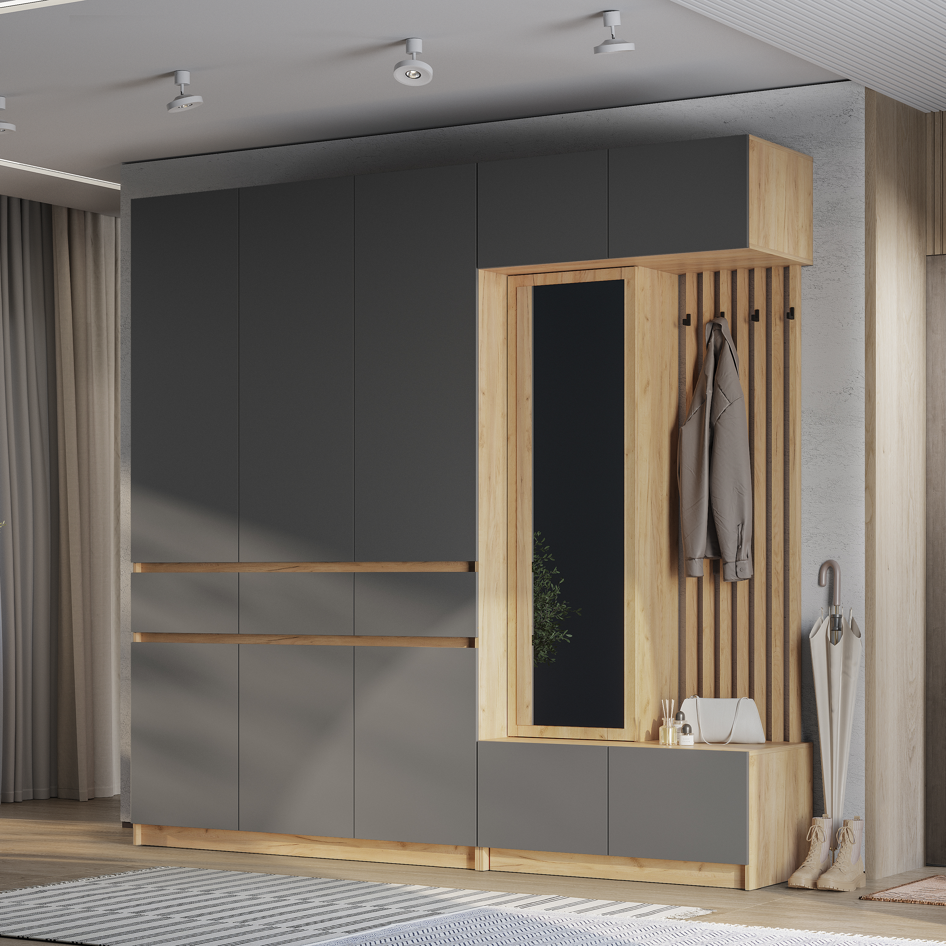 Стильная прихожая «Багира» – это оптимальное сочетание открытых и закрытых зон для хранения верхней одежды, головных уборов, обуви и аксессуаров.