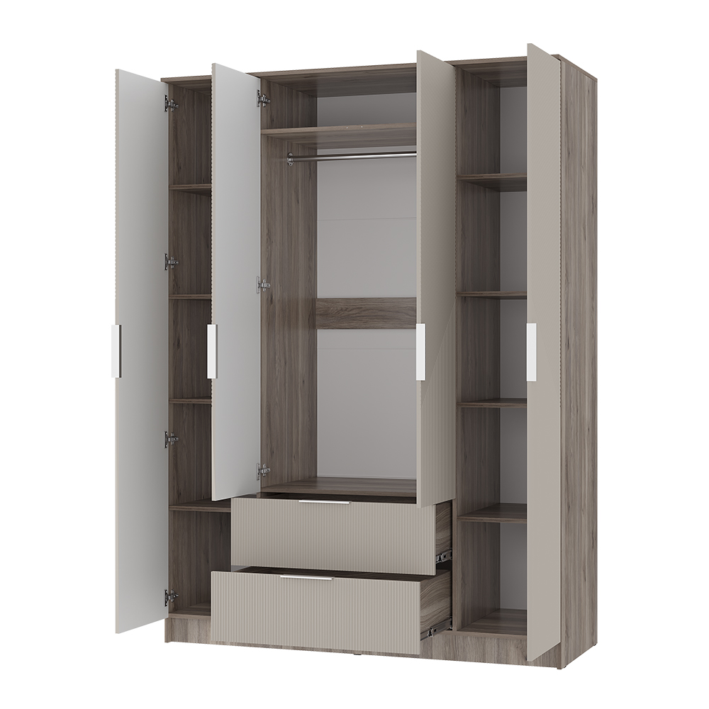 Шкаф четырёхстворчатый (ШК-11) имеет пять удобных полок по бокам для хранения одежды. Помимо этого, по центру расположены две вместительные секции для хранения ежедневной одежды. В нижней части шкафу находятся два вместительных ящика — это идеальное место для хранения обуви или постельного белья.