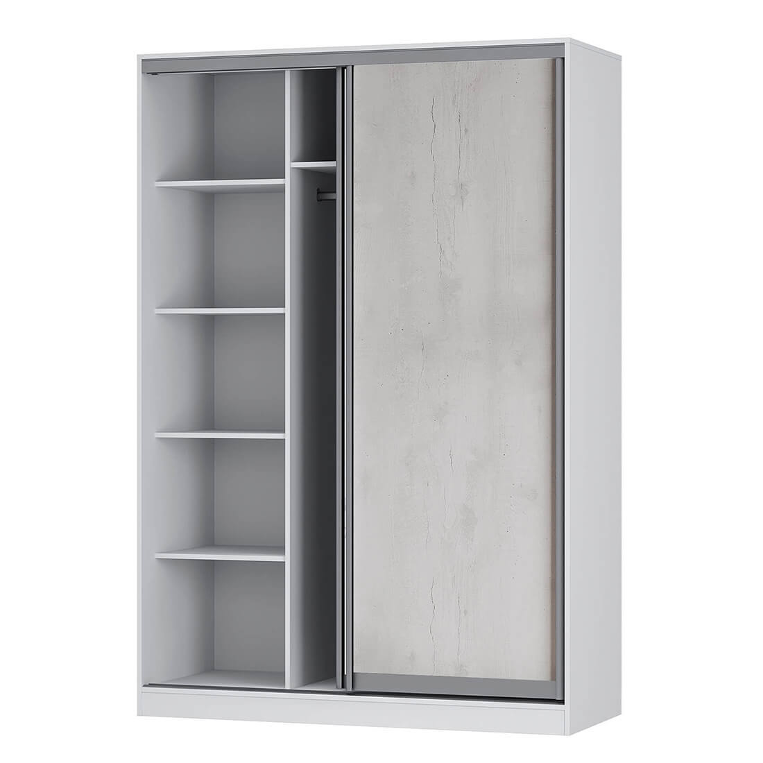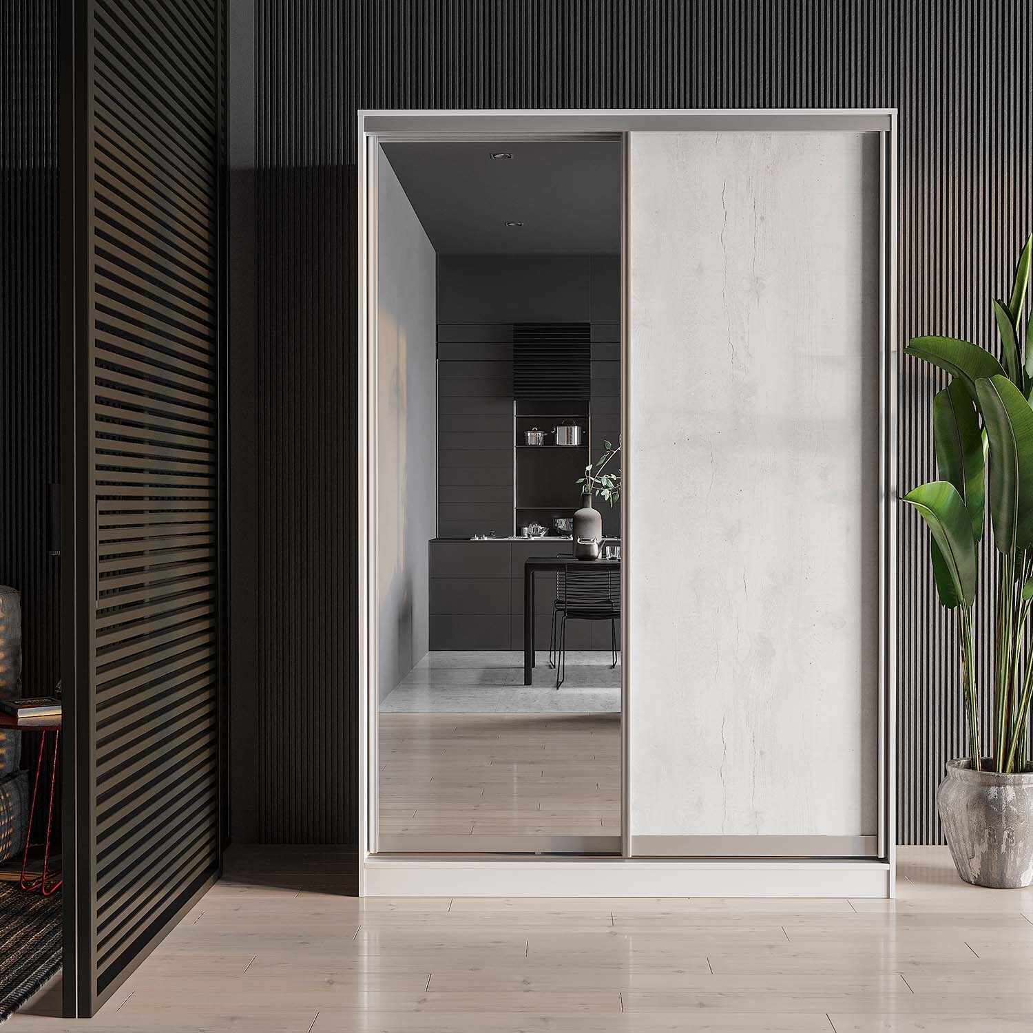 Шкаф-купе «Мадрид» представляет собой сочетание практичности и функциональности. Одна из створок полностью декорирована зеркалом с еврокромкой. Внутри с одной стороны находятся пять просторных полок для хранения вещей и постельного белья, с другой стороны – вместительная зона хранения с горизонтальной хромированной штангой для одежды на вешалках.