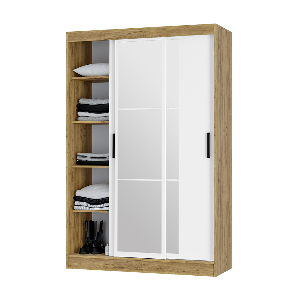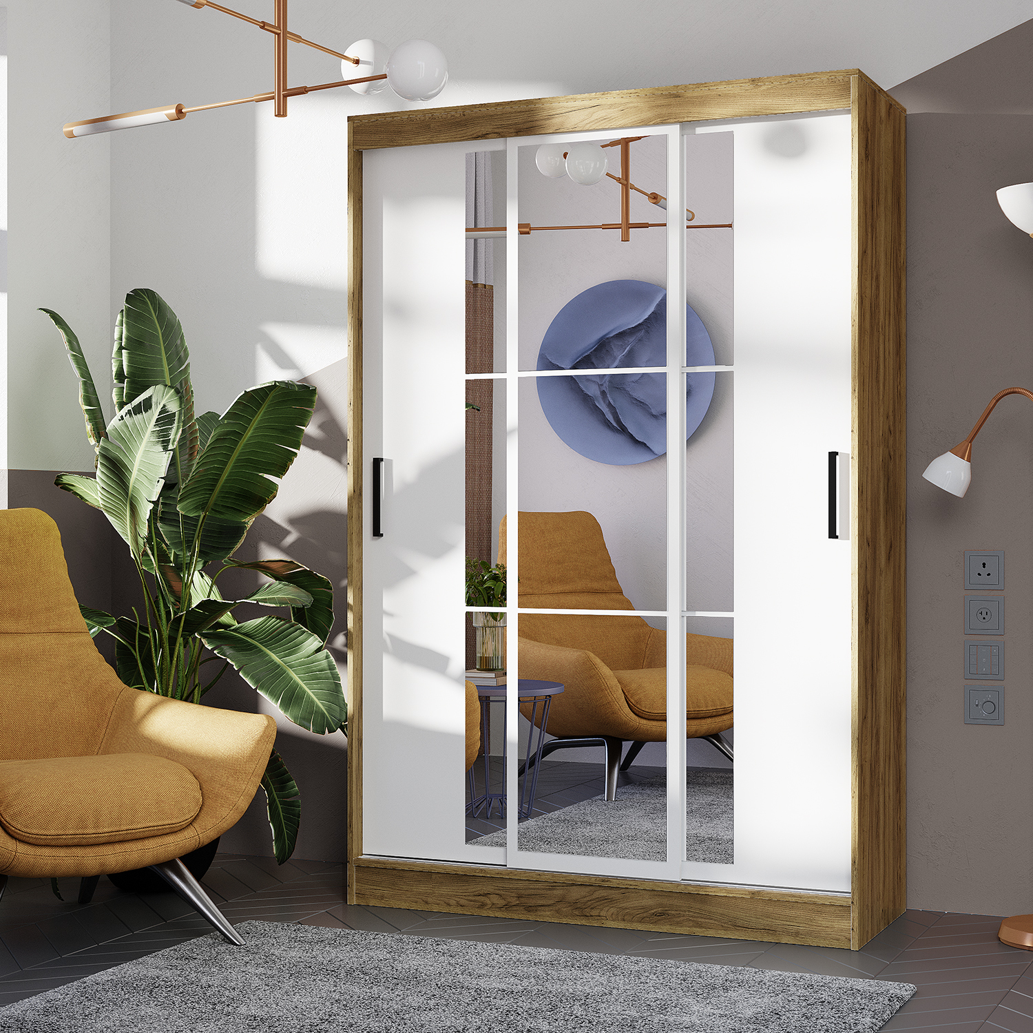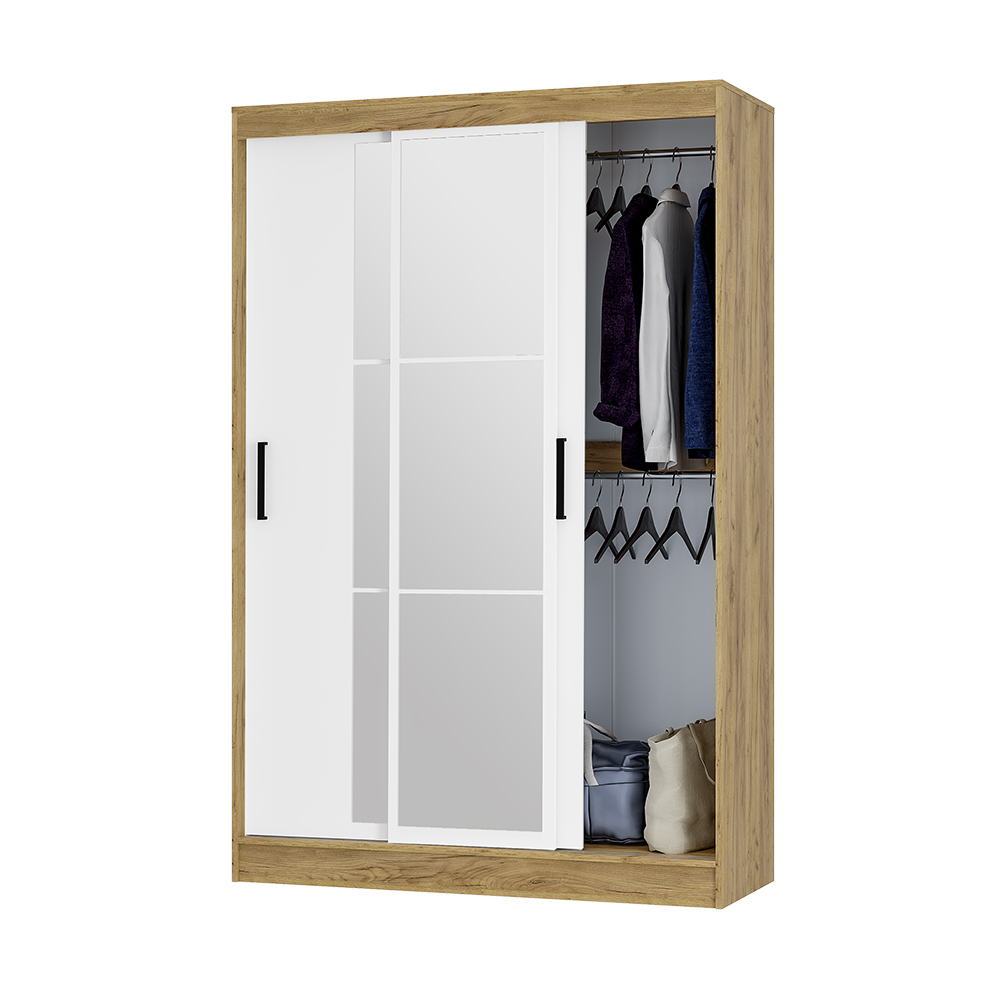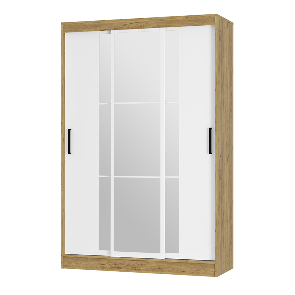 Трёхдверный шкаф-купе "Тайм" представляет собой сочетание практичности и функциональности. Это оптимальный вариант с точки зрения эргономики пространства. Раздвижные створки снабжены удобными ручками, центральная створка полностью декорирована зеркалом с еврокромкой, которое создаёт иллюзию расширенного пространства. Внутри с одной стороны находятся пять просторных полок для хранения вещей и постельного белья, с другой стороны – вместительная зона хранения с двумя горизонтальной хромированной штангой для одежды на вешалках. Все три створки шкафа подвижны.