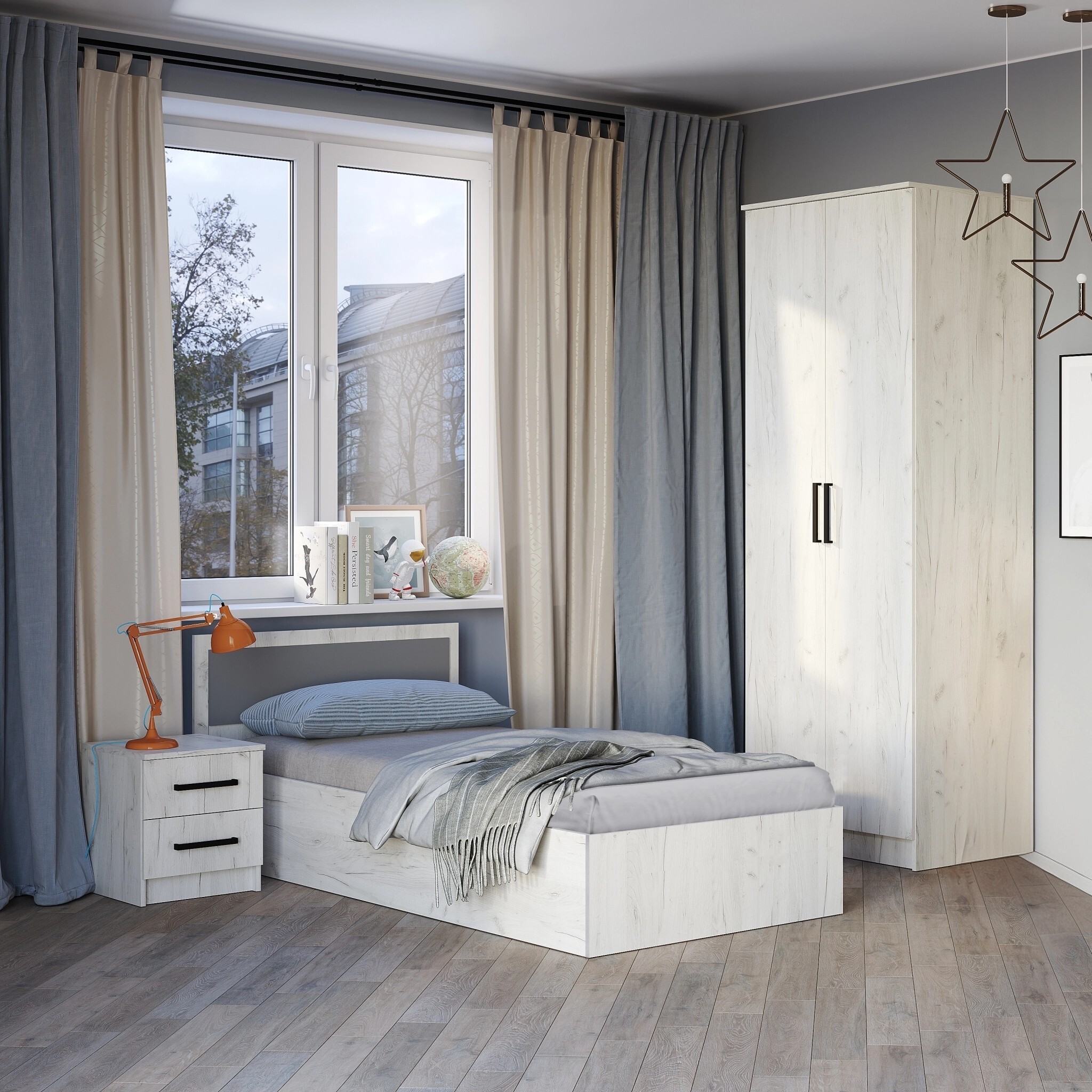 «Фиеста» - это стильная и универсальная коллекция мебели, которая включает в себя все необходимые предметы для обустройства комнаты. Светлый, трендовый оттенок «дуб крафт белый» создает атмосферу легкости и тепла. Накладные ручки контрастного цвета не только облегчают повседневное использование, но и являются стильным акцентом. Изголовье кровати декорировано накладкой в цвете «графит», что придает дополнительную особенность и шарм этой коллекции.