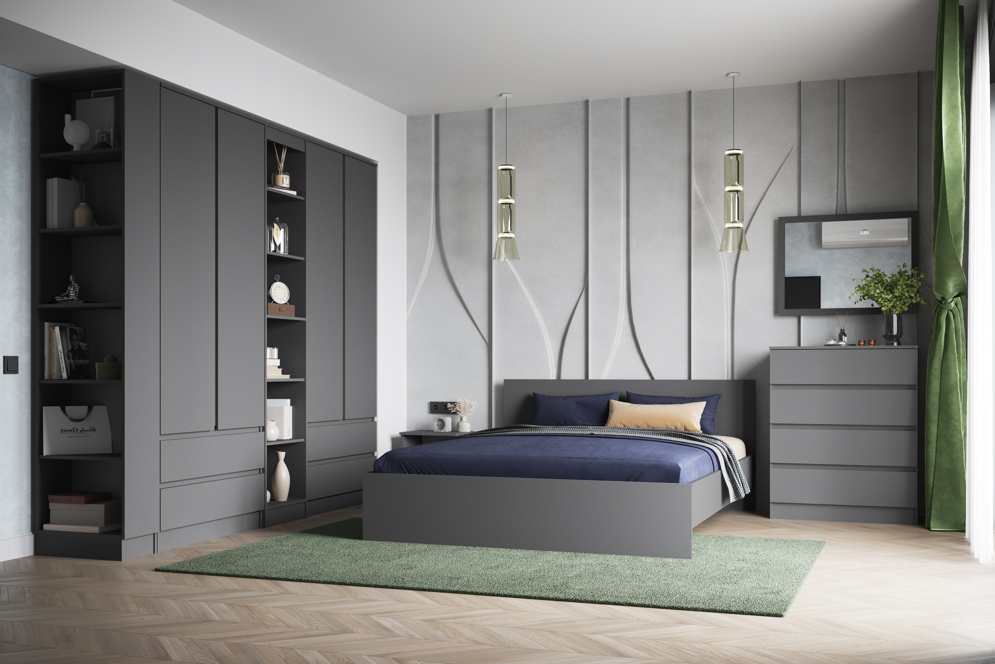 Спальня выполнена в цвете графит серый. В комплекте кровать с размером спального места 140 на 200 см, обеспечивающая комфортный сон. Для хранения одежды и личных вещей предусмотрены шкафы, которые обеспечат достаточно места для хранения. Комнату дополняет комод,открытый пенал который также предоставляет дополнительное пространство для хранения и декоративные возможности, а прикроватная тумба не только украшает интерьер, но и предоставляет удобное место для хранения мелочей. Общий стиль спальни можно описать как уютный и функциональный, что делает её идеальным местом для отдыха и хранения вещей.