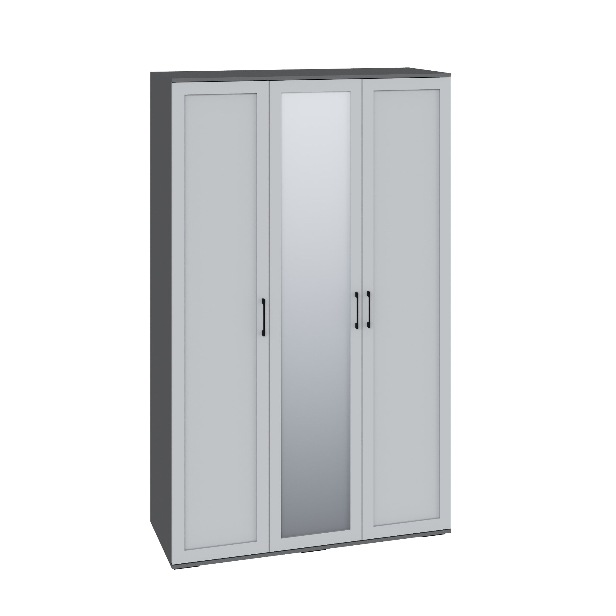 Двери шкафа укомплектованы зеркалами, что добавляет функциональности этому предмету мебели. Внутри шкафа имеется удобное разделение для хранения одежды, включая полки и штанги для вешалок.