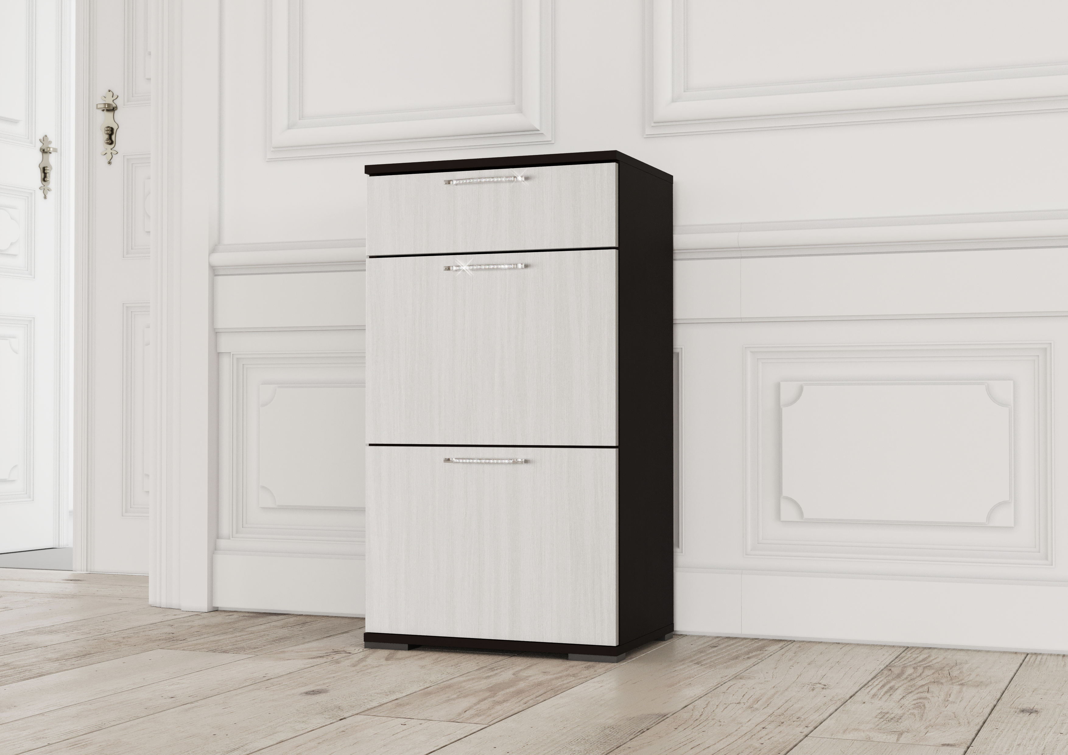 Тумба-обувница шириной 50 см — это практичное и стильное решение для хранения обуви в вашем коридоре. Она оснащена двумя откидными секциями, что позволяет легко организовать доступ к обуви, а также отдельным ящиком для мелочей, таких как ключи или щётки для обуви.