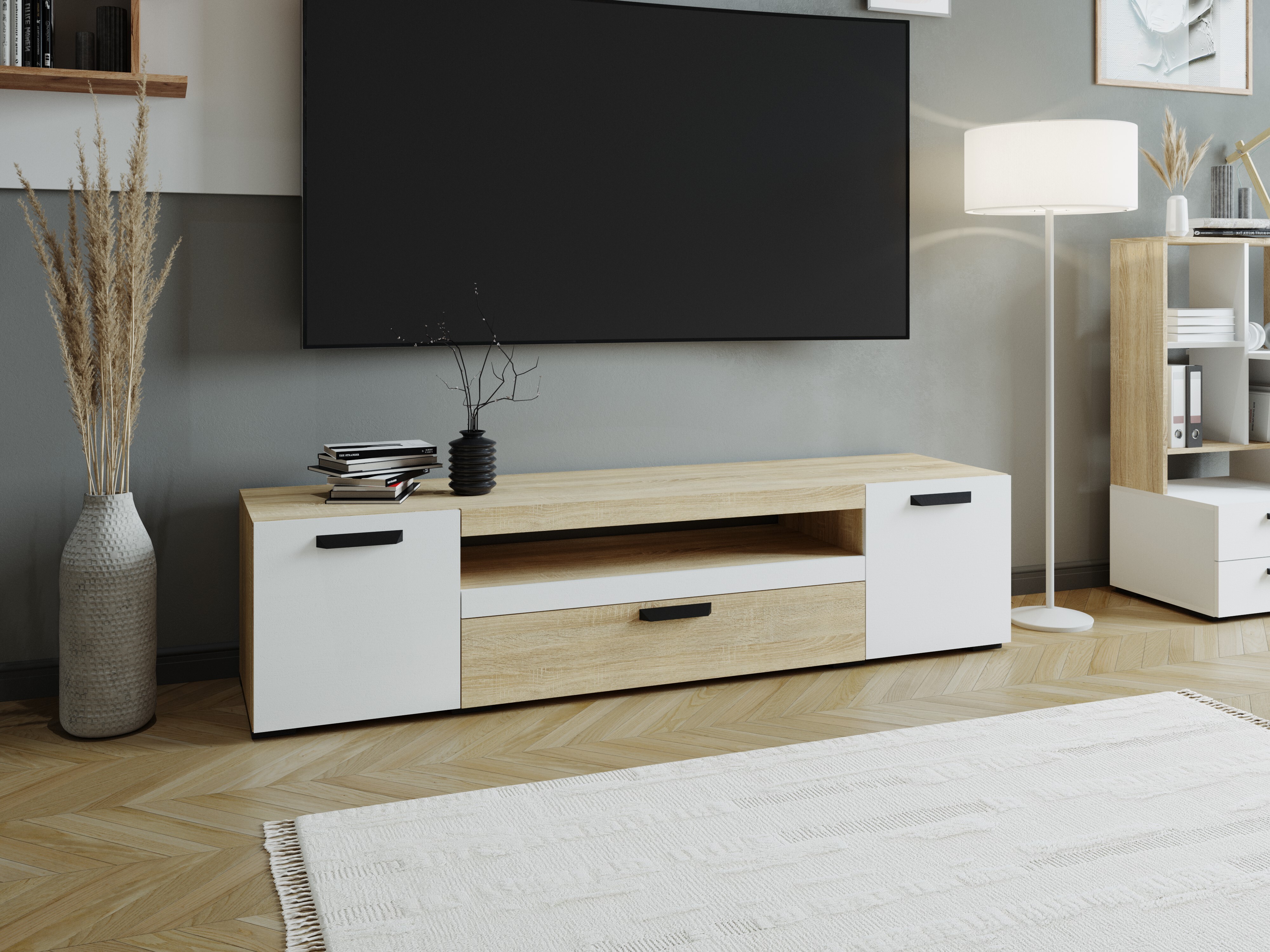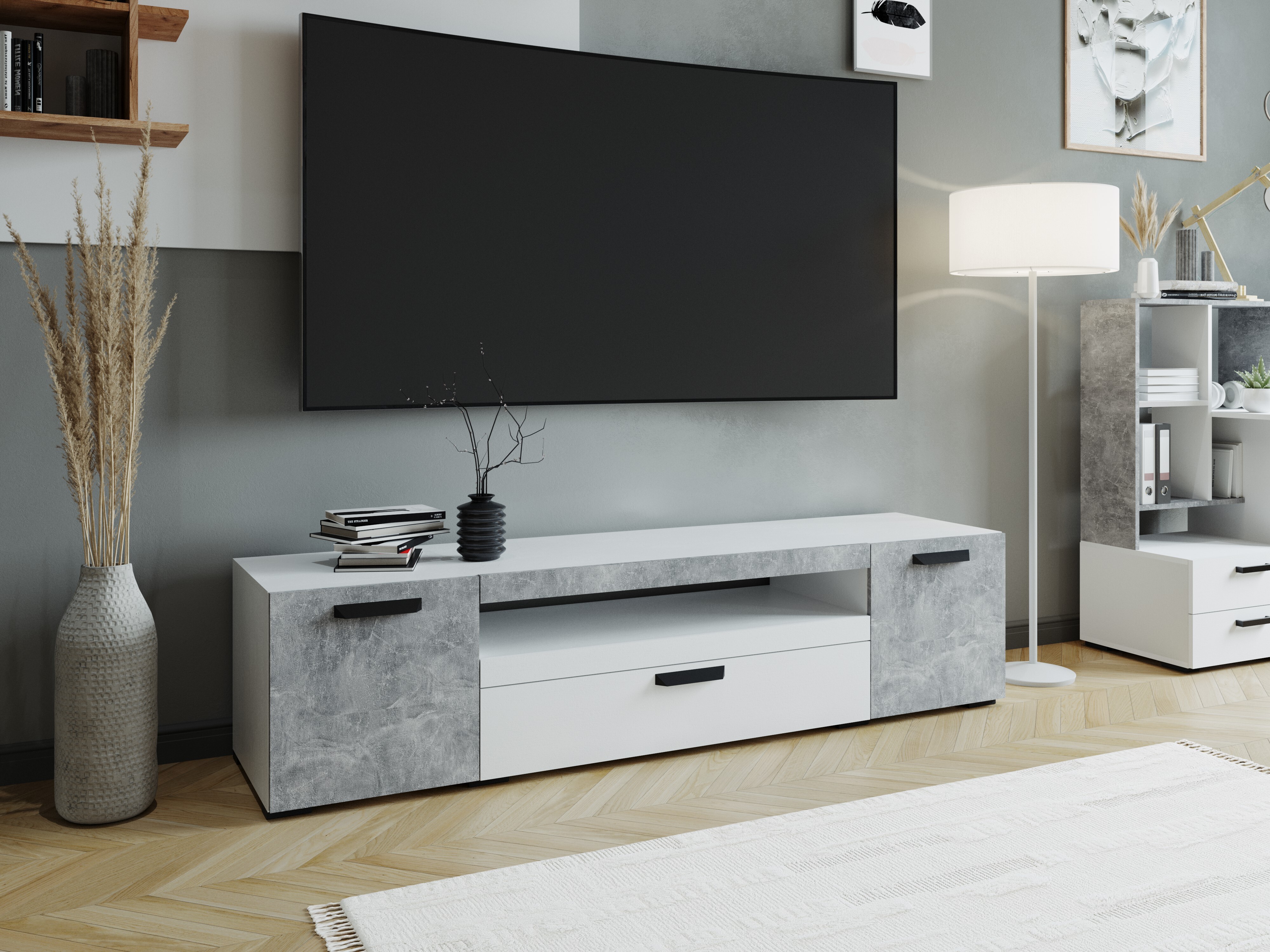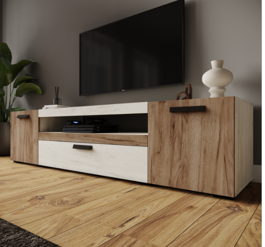 Тумба под ТВ шириной 190 см с ящиком, нишей и дверцами сочетает в себе функциональность и элегантность, придавая вашему интерьеру утонченный вид. С широким пространством для размещения телевизора, эта тумба также предлагает удобную нишу для размещения различных устройств, таких как DVD-плееры, игровые приставки и т.д.