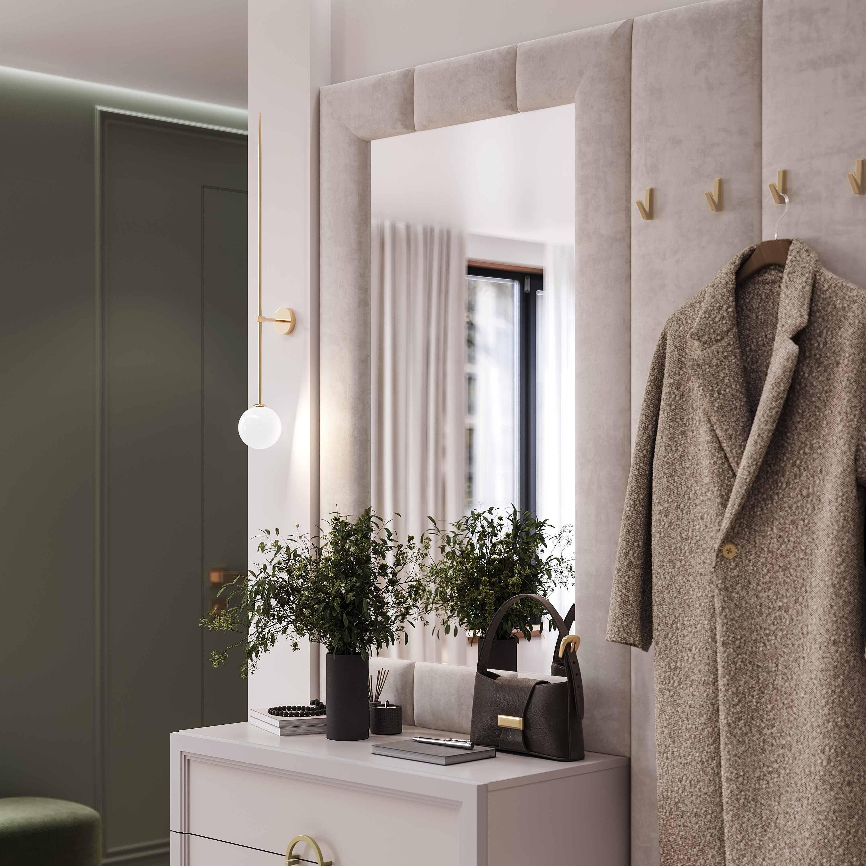 Зеркало "Эстетика" - стильный и функциональный предмет интерьера. Мягкая часть - мебельная ткань "мокко". Крепление к стене - навес плоский.